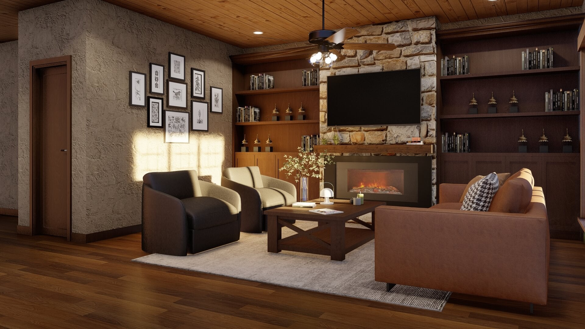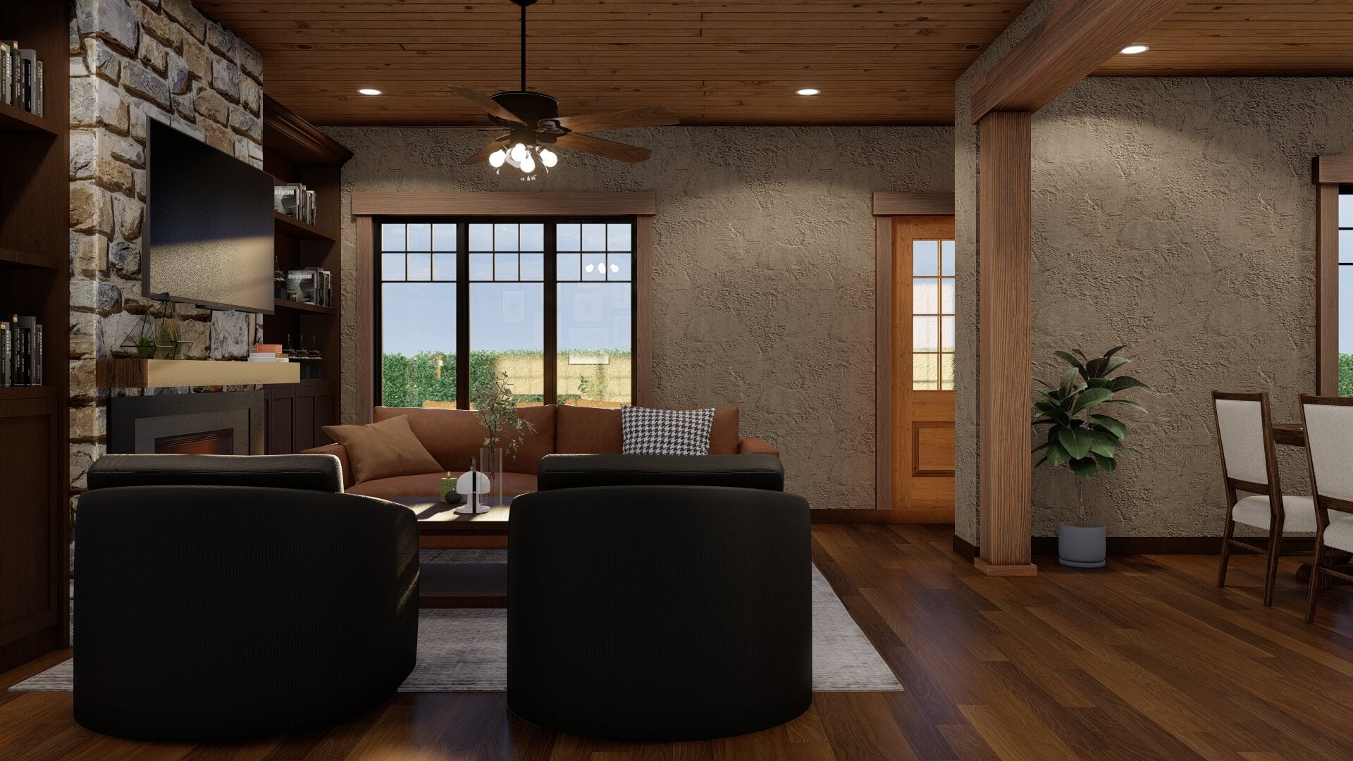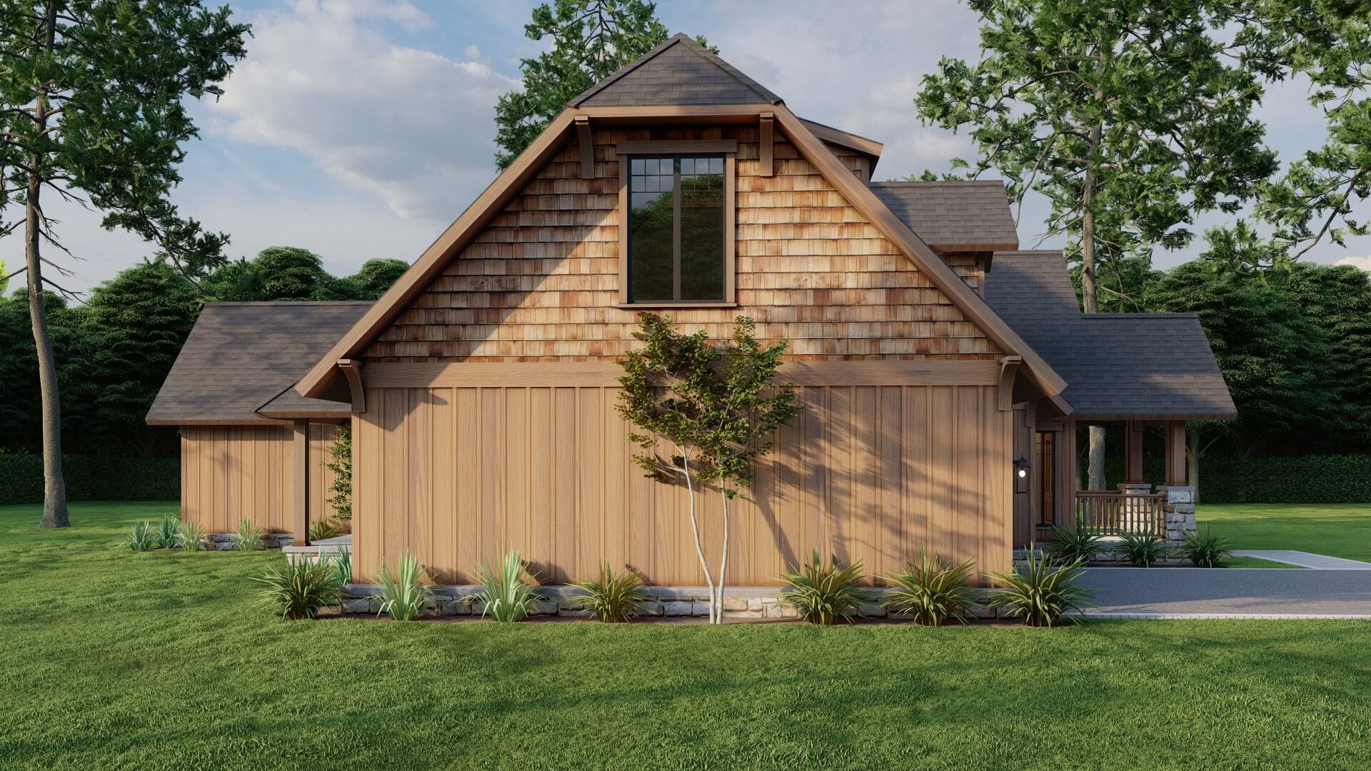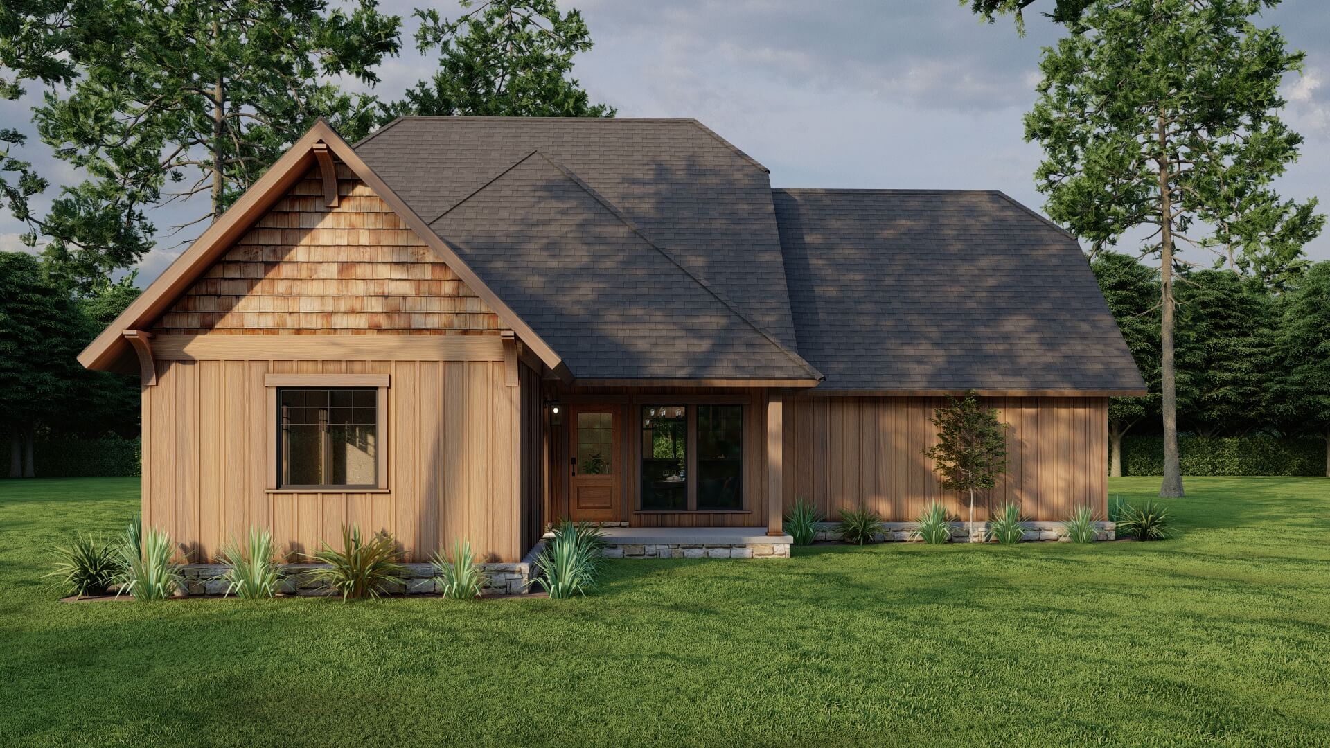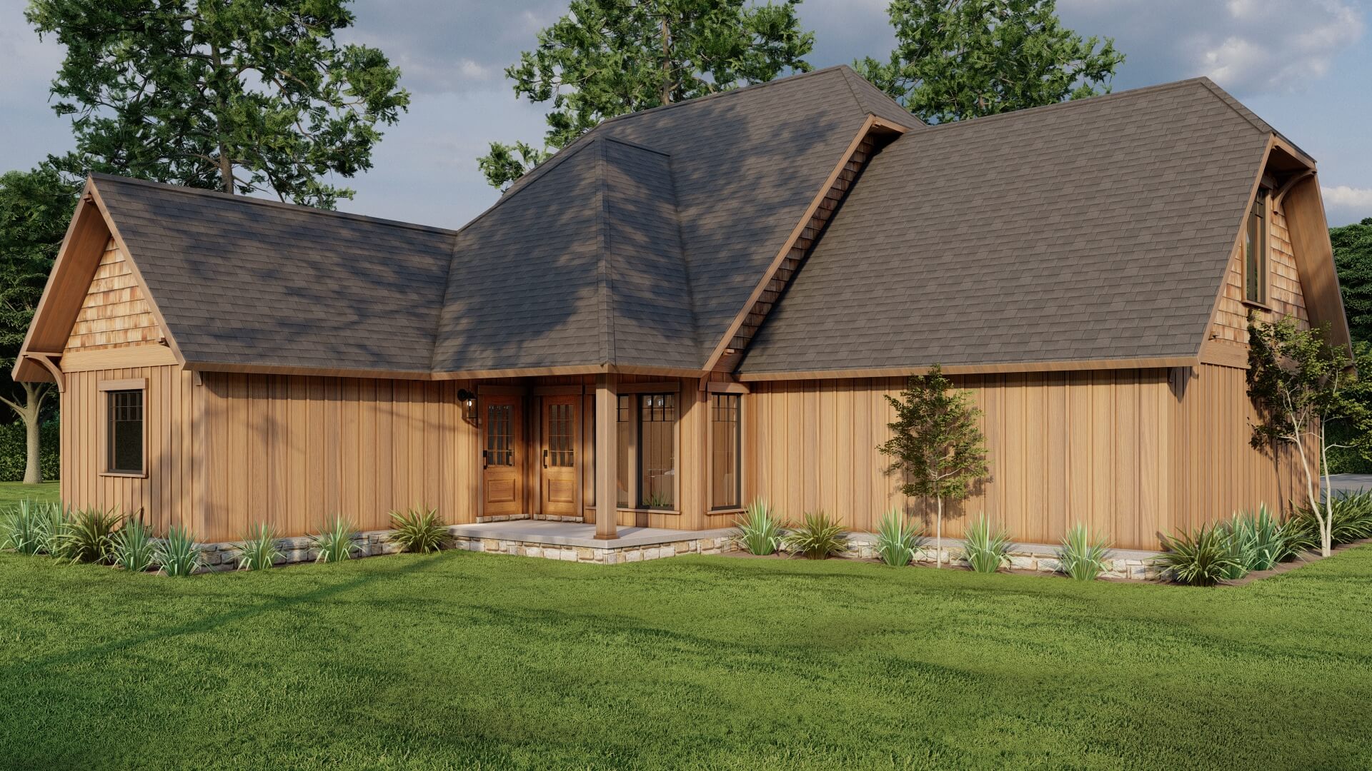 • 1.5‑story Riverbend‑style design with rustic exterior