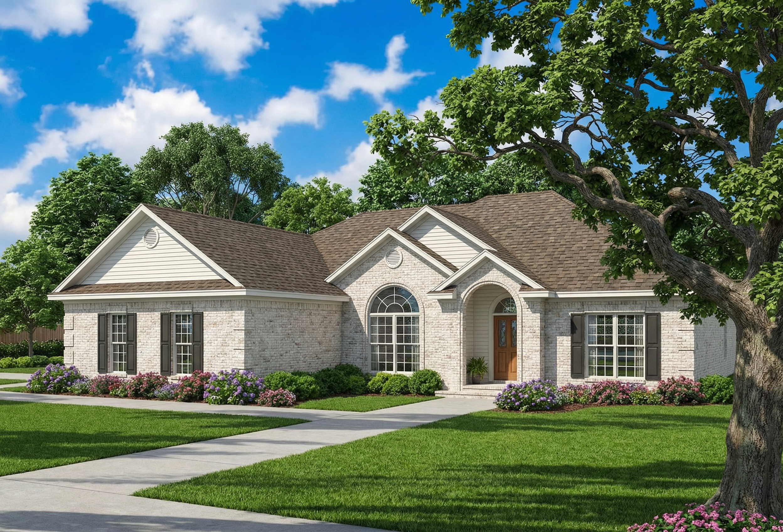 - Inviting curb appeal: A covered front porch and arched entry create a welcoming atmosphere.