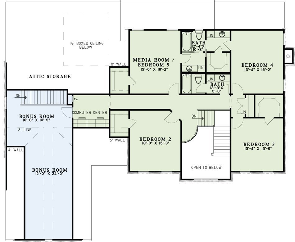 This five bedroom design provides every member the luxuries they desire. The covered porch welcomes friends and family into the open foyer. The dining room, open kitchen and great room will allow entertaining for the holidays easy. The secluded master suite provides two walk-in closets well as a whirlpool tub everyone will appreciate. The upper floor allows the children to have their own space. The convenient computer center makes homework easier. The media and bonus rooms allow for future expansion as the family?s needs change.