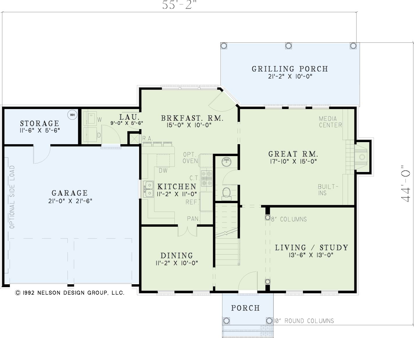 Tall columns punctuate the elegant appearance of this four-bedroom Colonial-style home. The roomy entry connects the formal living and dining areas for those special occasions while the great room’s fireplace, nestled among built-in media center and bookshelves, provides the ideal setting for gatherings both large and small. The central kitchen location makes it easy for one and all to retrieve that special dessert and afterwards, everyone enjoy casual conversation on the spacious grilling porch.