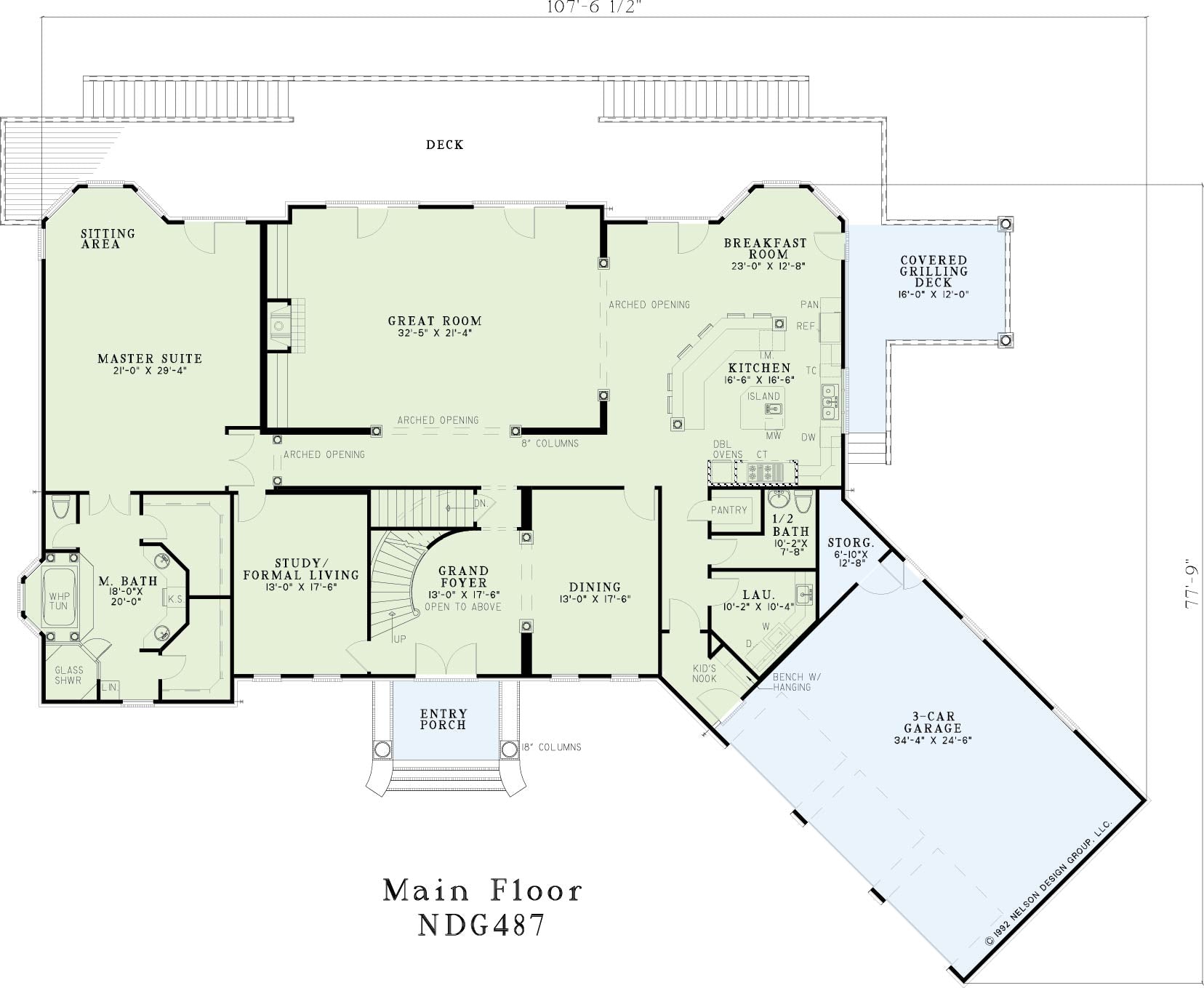 Three levels hold all of the amenities in this luxurious Nelson Design Group home. The main floor features a grand foyer that ushers your guests into the dining room with columns. This kitchen was designed with the chef in mind and features double ovens, an island workspace, and bar seating. A covered grilling deck is also available for cookouts just off of the expansive rear deck. The upper floor of this home houses four bedrooms and two full baths, as well as plenty of storage space. The lower floor, however, could be the favorite of the entire family. A large game room and home theater can be found here, along with the option of a future workshop.