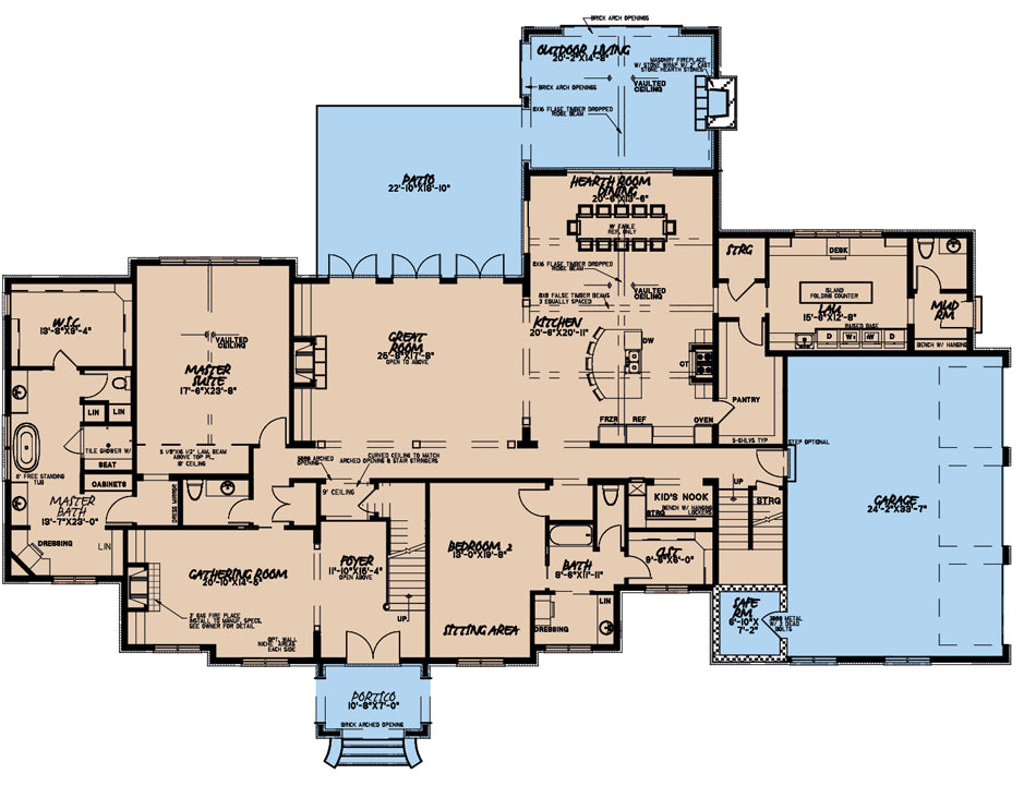 - Outdoor Living: Covered rear porch with vaulted ceiling, arched brick openings, masonry fireplace, and direct access from the great room and kitchen