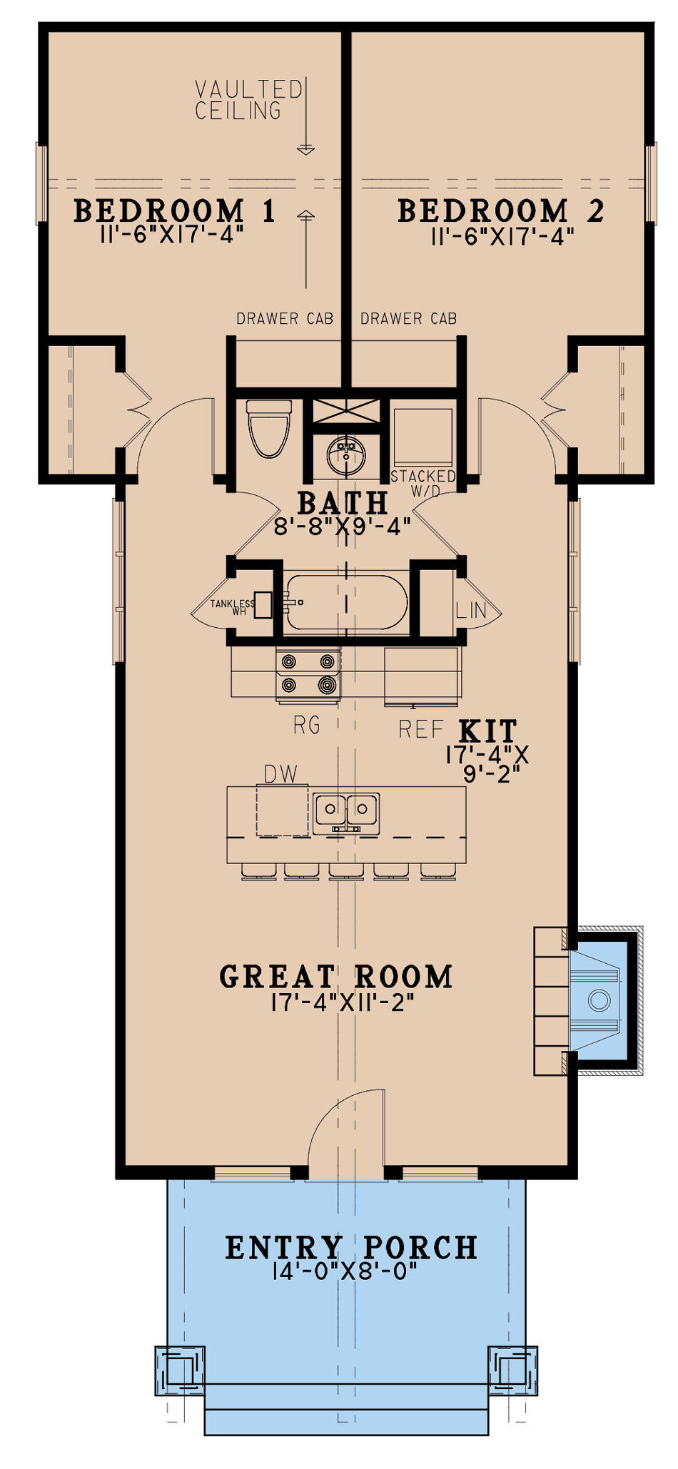 - Vaulted ceiling in the great room and kitchen creates an open, airy feel despite modest size