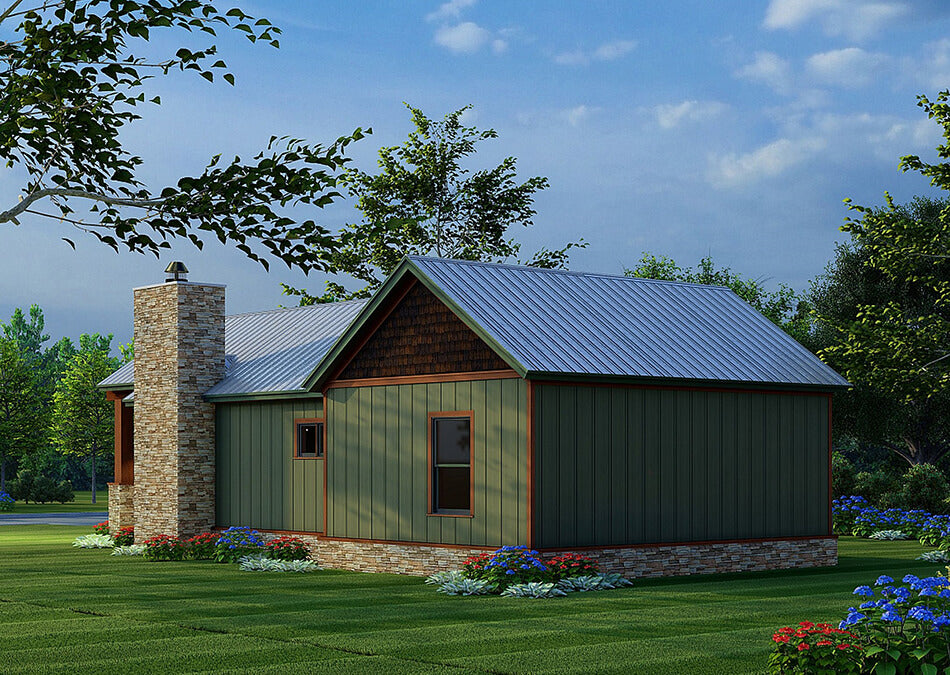Discover alpine tranquility with the Creek Side House Plan MEN 5300, a 921 sq ft single-story mountain retreat featuring 2 bedrooms and 1 full bath. With vaulted ceilings, a board-and-batten and stone exterior, and a welcoming covered front porch, this plan blends rustic character and smart living for a cozy getaway or everyday home.