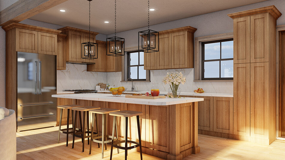 The exterior of the Alpine Cottage features a dramatic porte-cochère entry and contrasting materials that create a timeless first impression. Inside, the open-concept great room features vaulted ceilings and flows seamlessly into a spacious kitchen with a large center island—ideal for entertaining and family gatherings. Every element of this layout has been thoughtfully designed to maximize space and natural light.