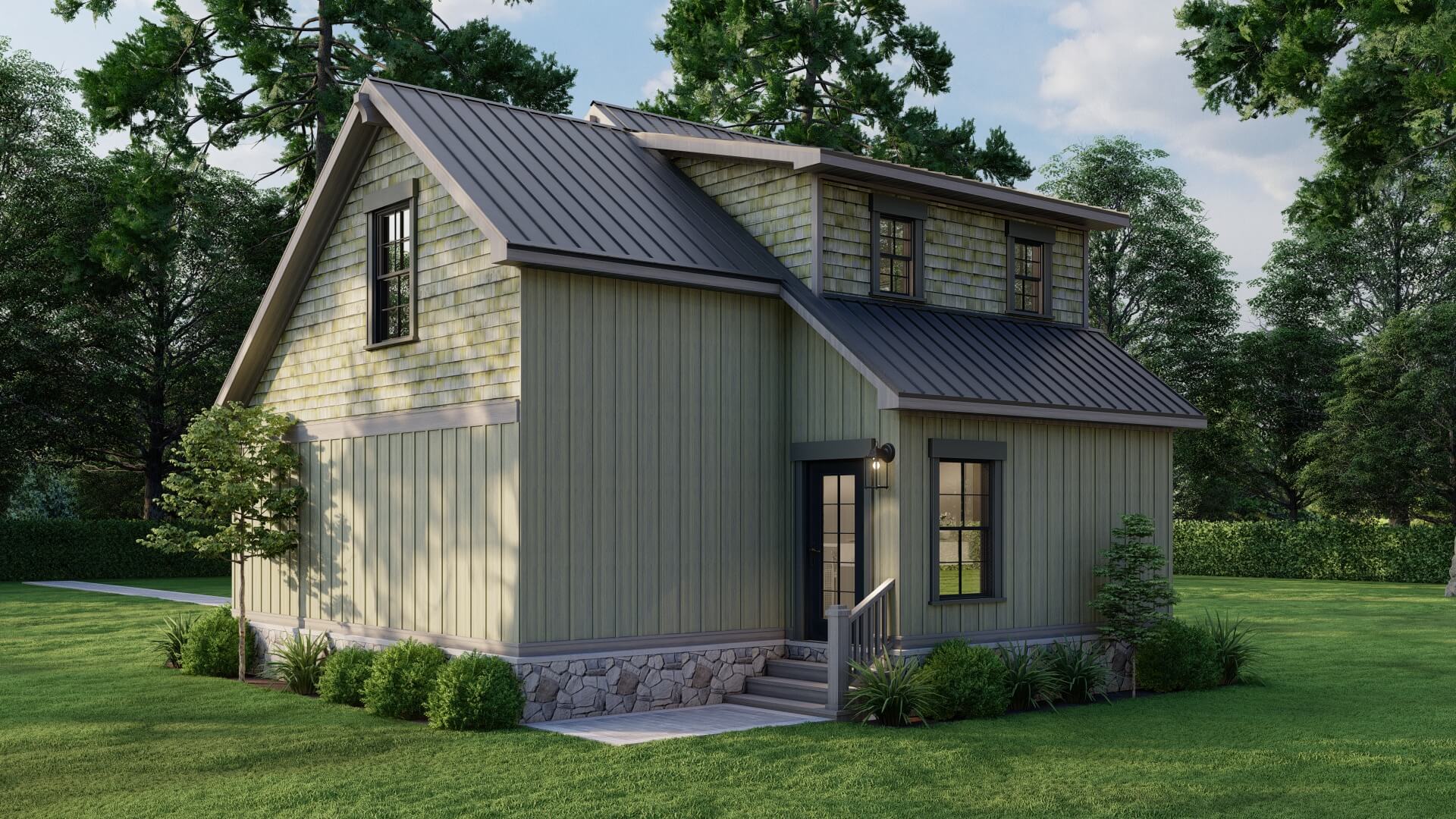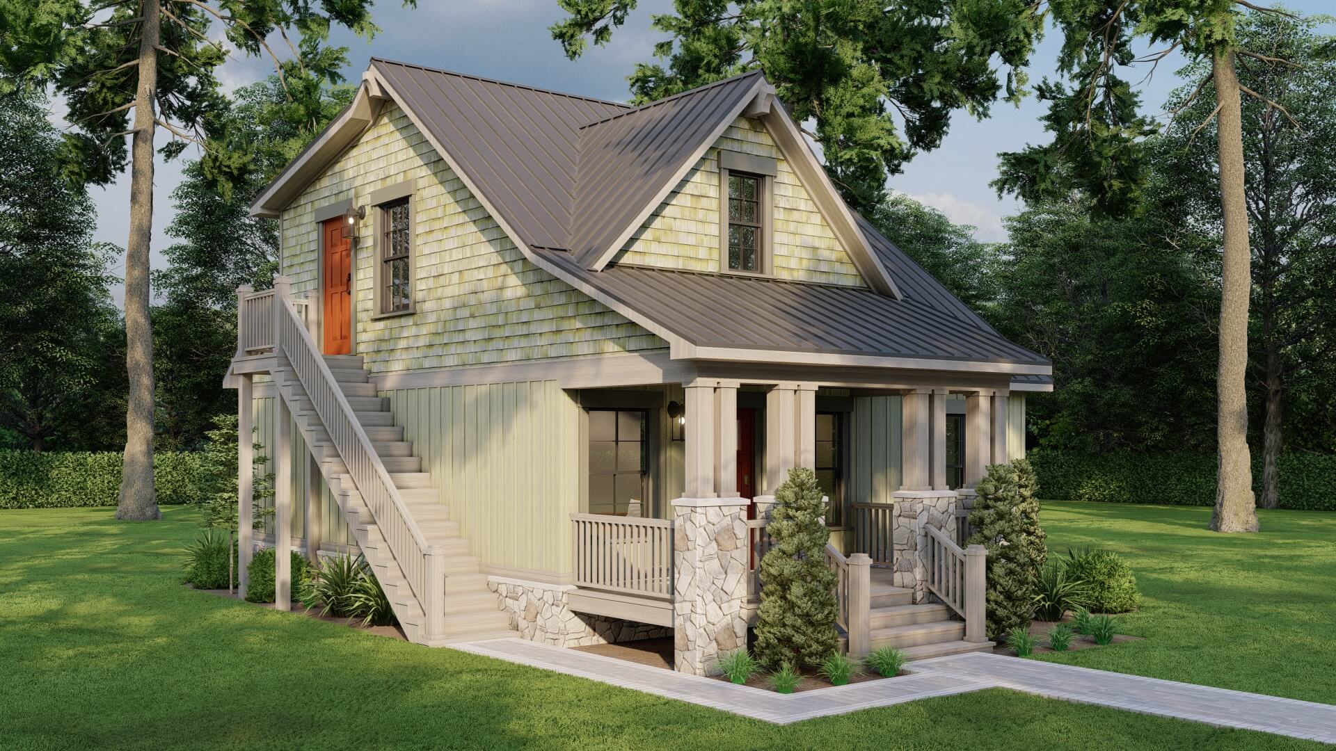 Discover the inviting simplicity of the Otter Creek Cottage House Plan MEN 5424, a cozy two-story retreat offering 1,345 sq ft of living space with 2 bedrooms and 2 full baths. With its rustic covered porch, open living area, and second-floor lofted living quarters, this plan perfectly blends charm and flexibility for a vacation cottage or small family home.