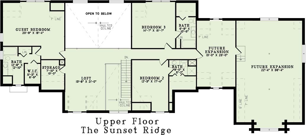 The opposite side of The Sunset Ridge is occupied by the spacious Master Suite, which enjoys private access to the massive deck outside. The master bath offers a relaxing soak in a whirlpool tub by the window, as well as a dual sink vanity and a large walk-in closet. Upstairs, you will find all the space you could ask for! A large guest bedroom holds a private bath and walk-in closet on one side, while the other side holds bedrooms 2 and 3, each with their own bathrooms. In the middle is a sleeping loft open to below, and two large rooms are available at the far right end for future expansion. How would you customize this amazing house plan?