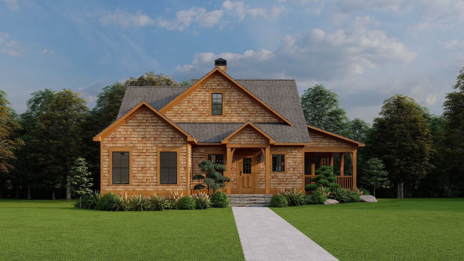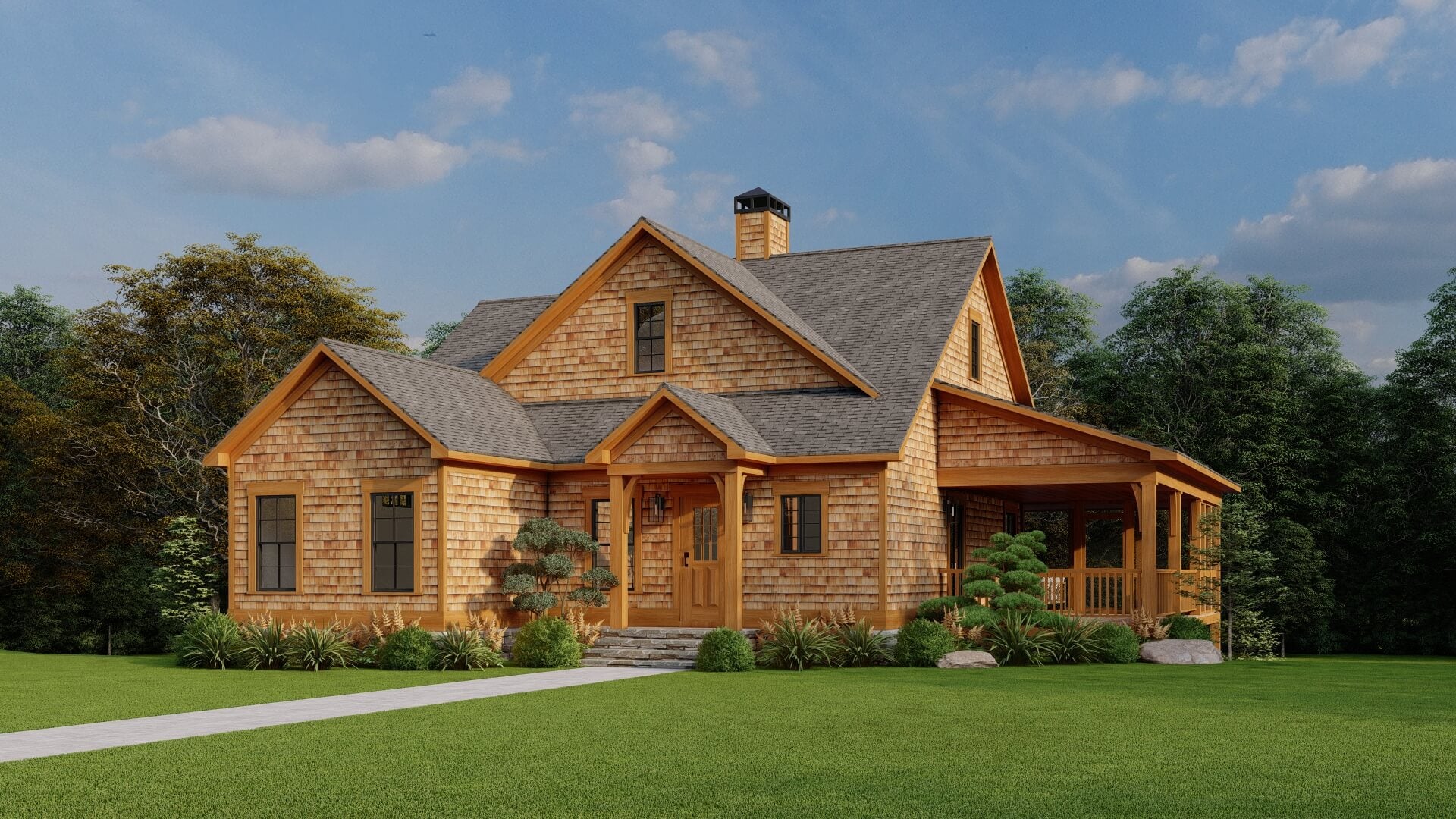 The design features attractive rooflines, mixed siding textures, and covered porches that lend warmth and curb appeal without excess.