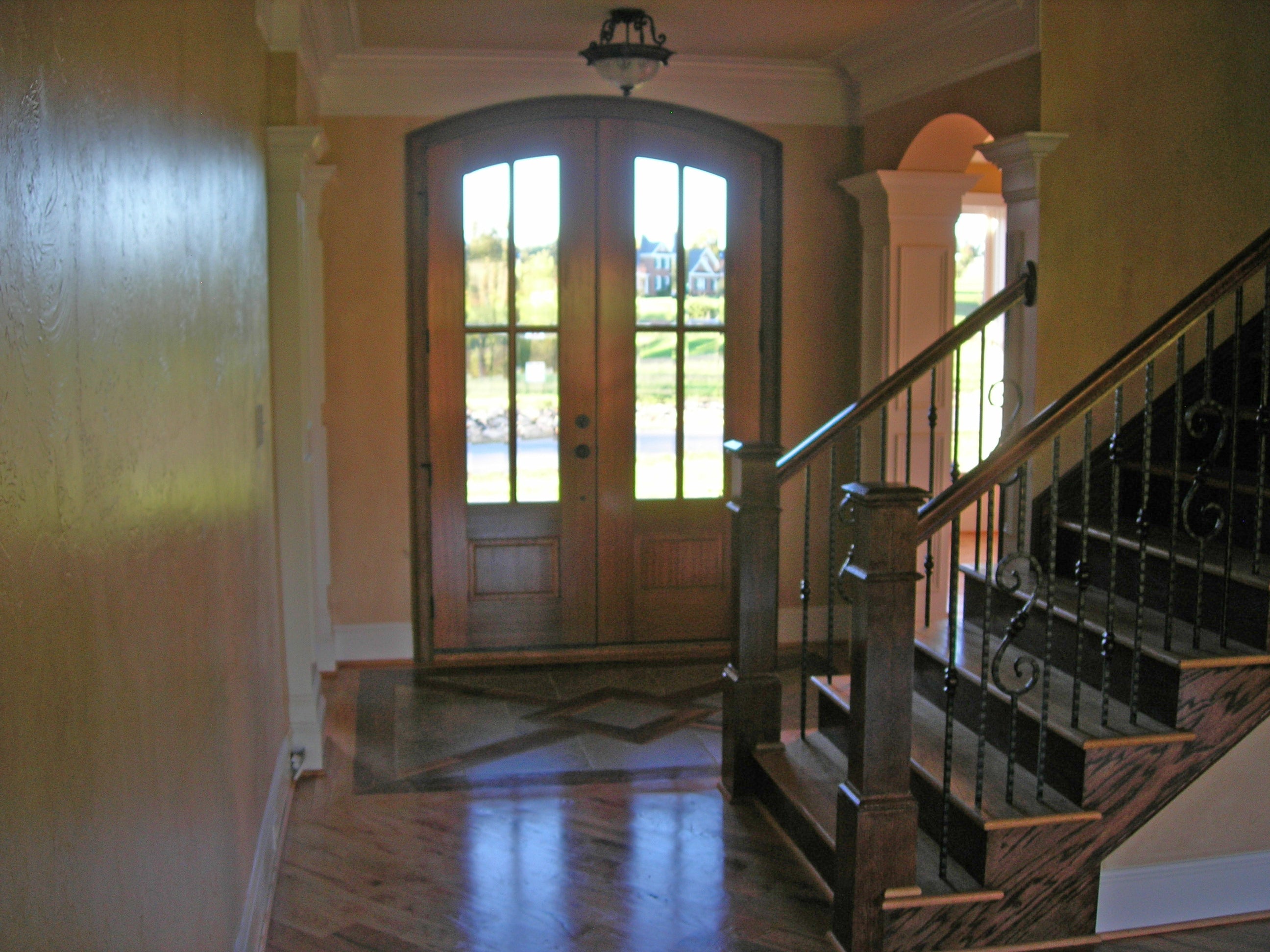 A soaring foyer, from which a curved wall of windows brightens the formal dining room with natural light.