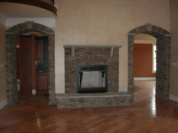 An open great room with fireplace, seamlessly connected to the kitchen through arched pass-throughs—ideal for gathering and entertaining.
