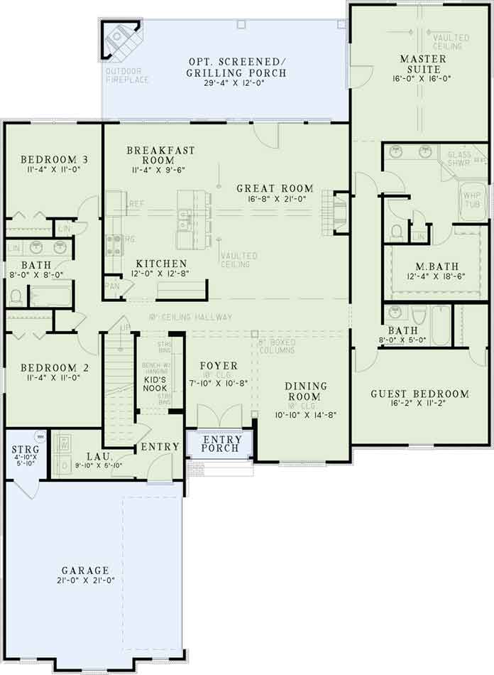 - Kitchen with a center island that faces the Great Room fireplace — encourages interaction and makes cooking part of the living space.