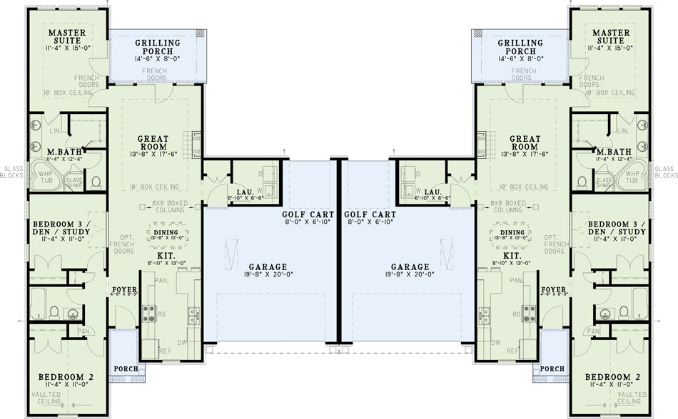 Natural rock and boxed columns give this duplex wonderful street appeal. This floor plan has ten foot-boxed ceilings in the great room and master suite bedroom and a vaulted ceiling in the front guestroom. Columns are used to frame the dining area while enjoying a view of the great room. The master suite has French doors leading to the grilling porch and a luxurious private bathroom. The center bedroom has optional French doors and is perfect for a home study. The double car garage has a rear golf cart bay for that glorious golf course living.