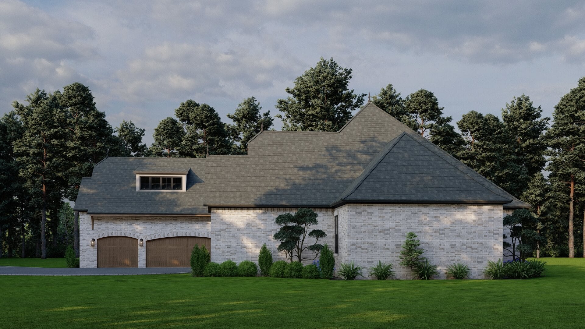 The cottage exterior blends brick and stone accents with an arched entry and a courtyard garage, giving it a refined yet down‑to‑earth appeal. -
