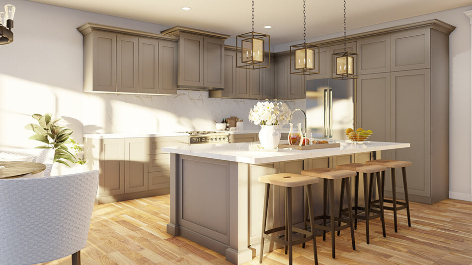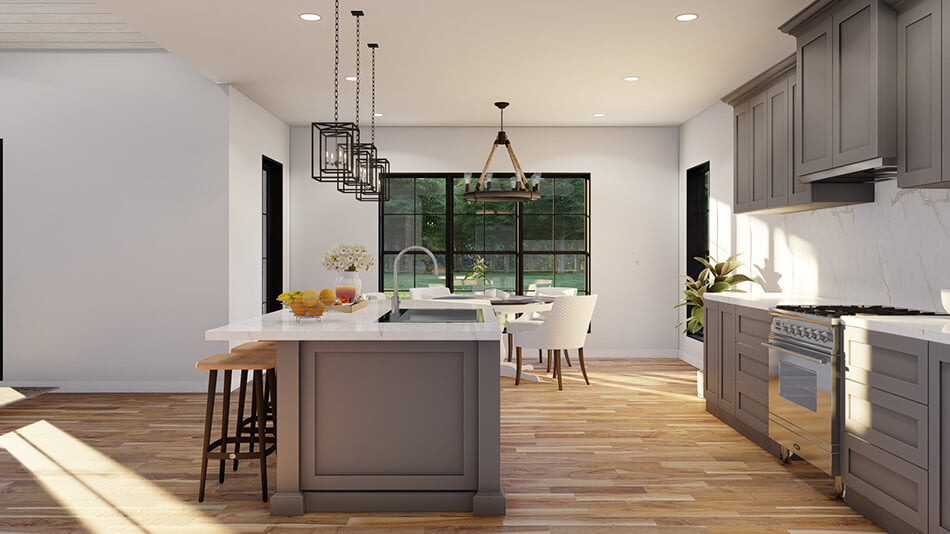 The kitchen offers generous counter space, an island, and an adjacent dining area, all enhanced by a large walk-in pantry for convenient storage. -