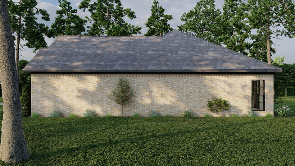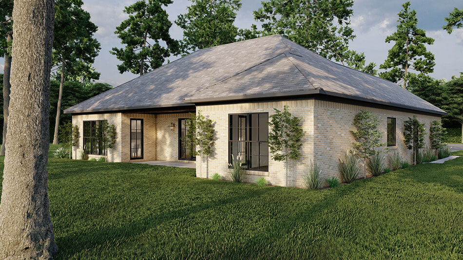This plan offers a thoughtful split-bedroom design, ensuring privacy for the master suite while keeping secondary bedrooms together on the opposite side of the home—perfect for families or guests. -