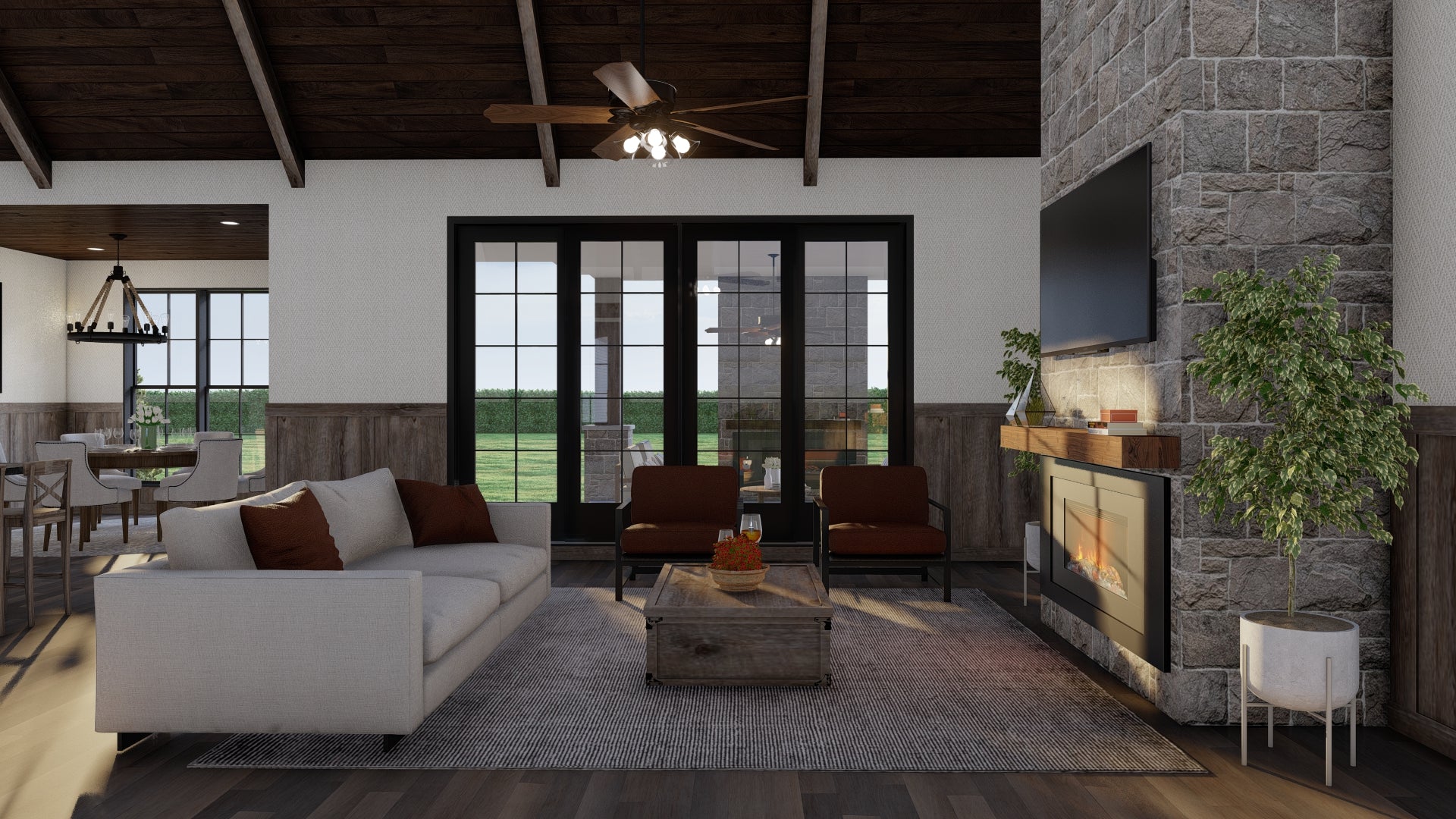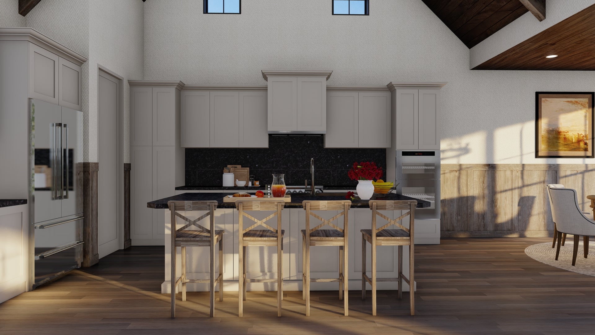 The Great Room features a vaulted ceiling with exposed timber beams and a cozy fireplace. Its openness allows it to flow directly into the kitchen—perfect for modern family life and entertaining.