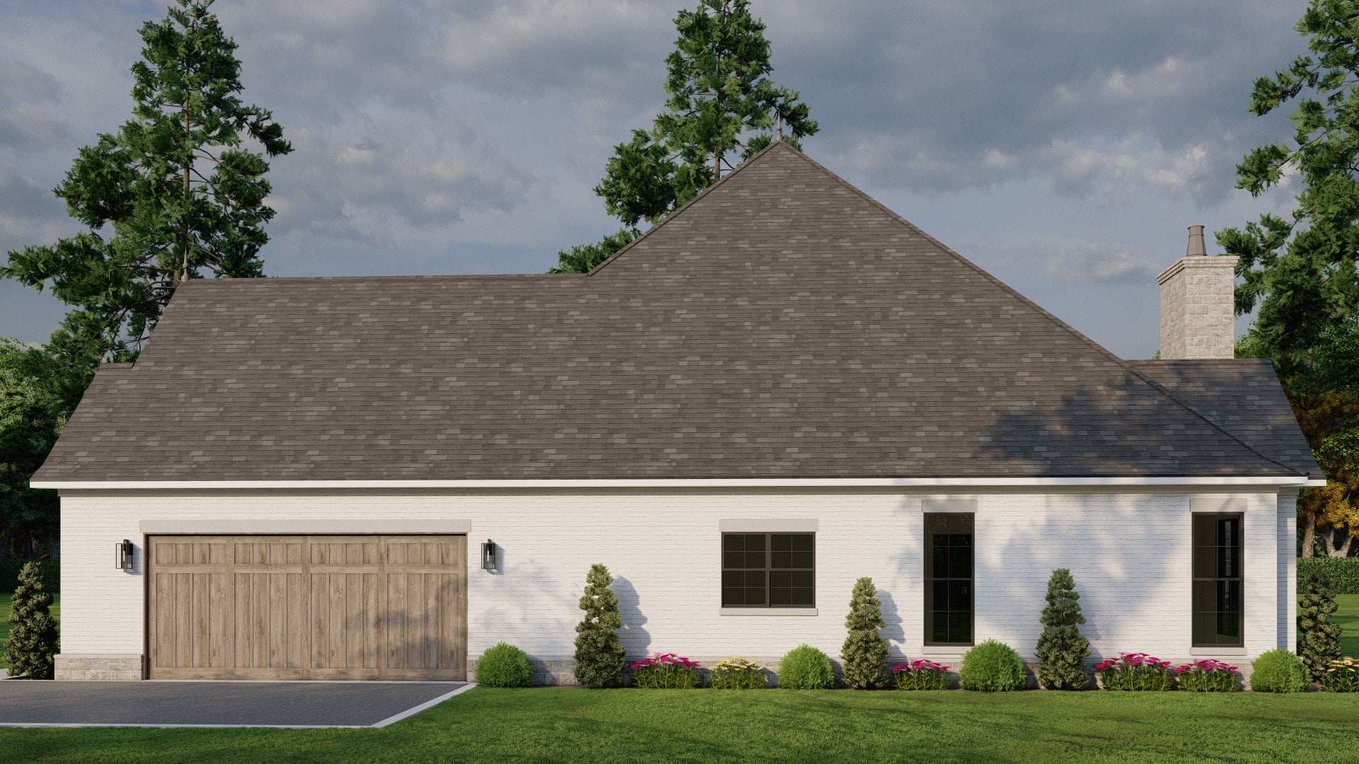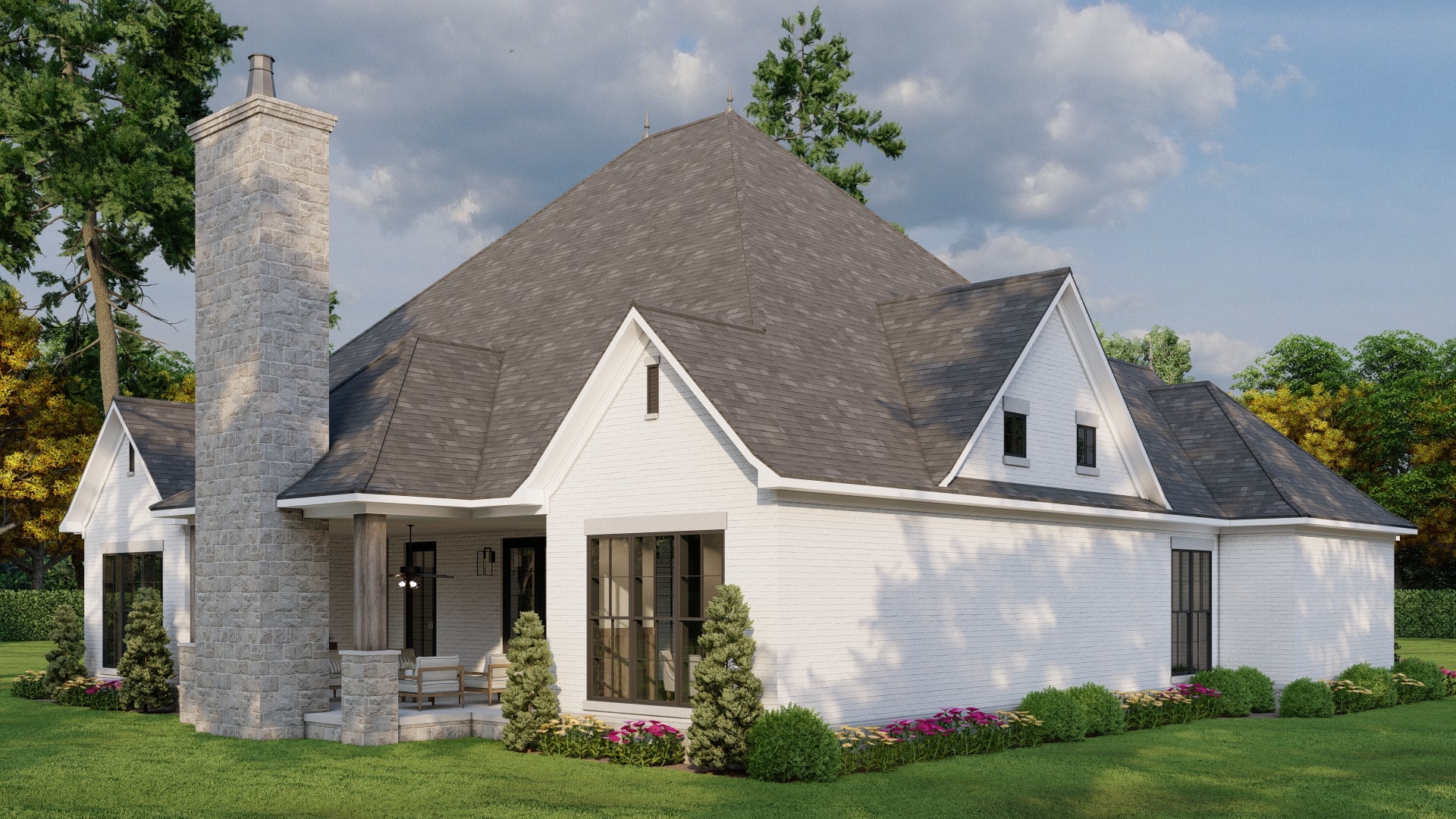 As you approach, you’ll appreciate the elegant roofline, blend of stone and brick siding, and rustic wood shutters — all combining to create a refined and welcoming façade.