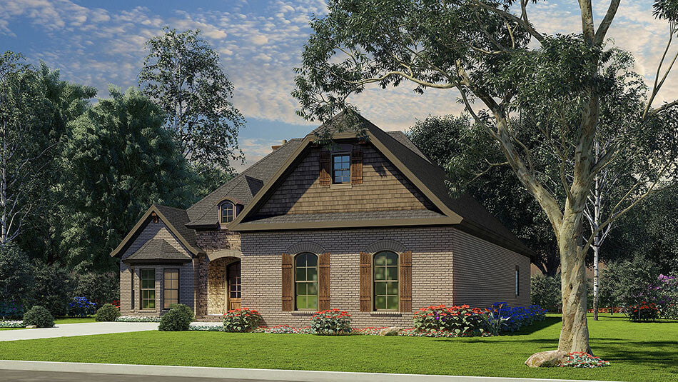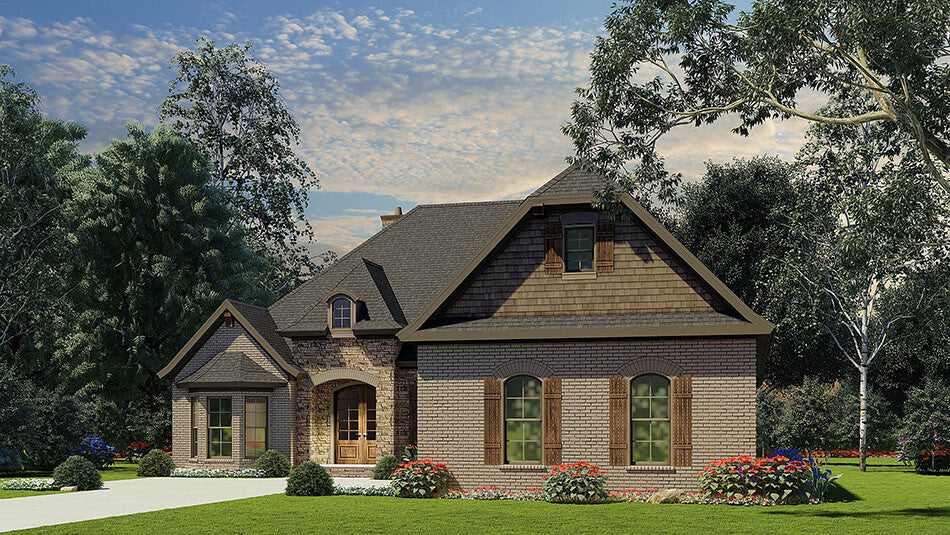 - European character with warm materials: The exterior blends brick, stone, and shake siding, complemented by European accents that create visual appeal and classic presence.