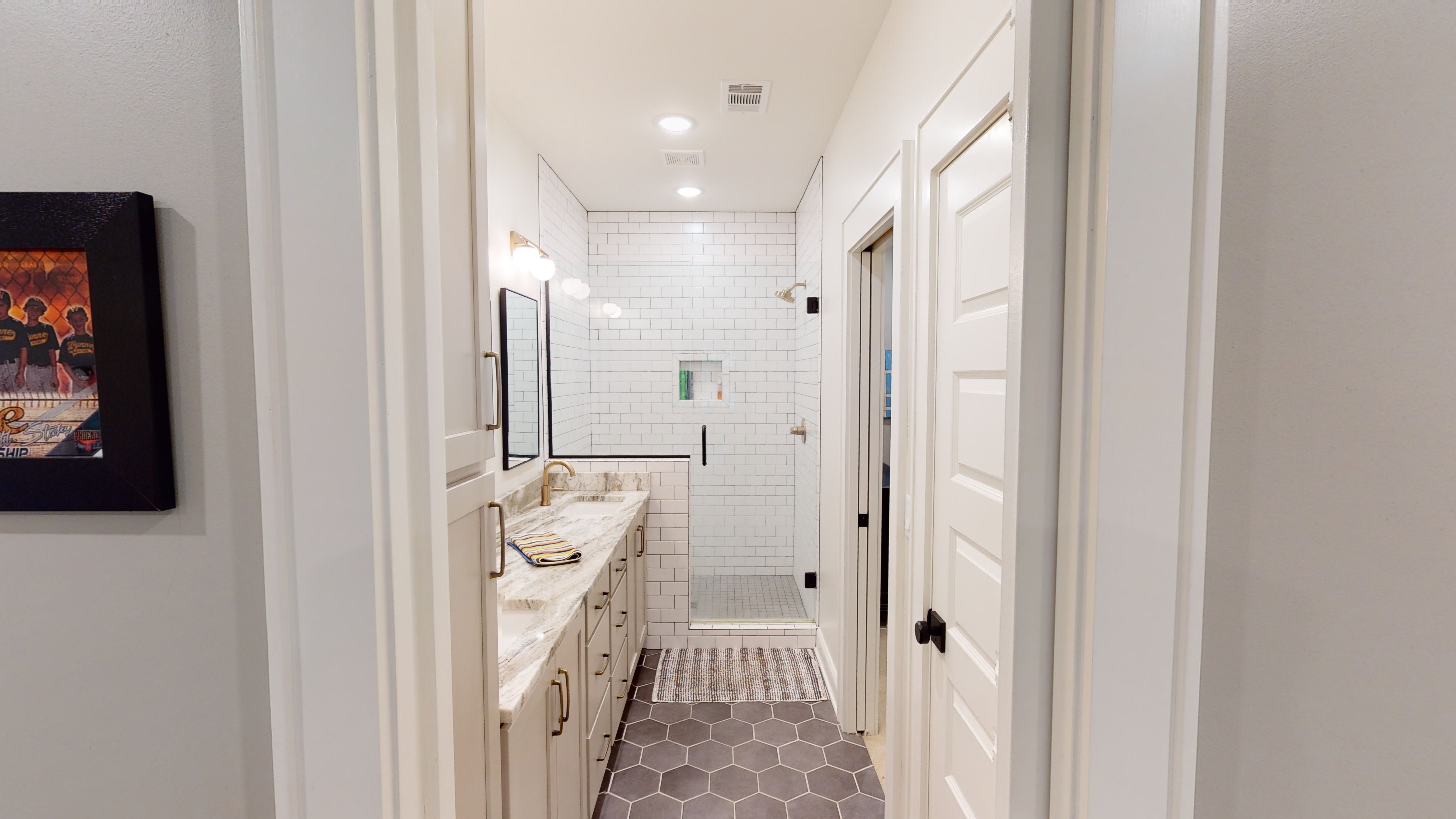 Almost 4,500 square feet of luxurious living await you in this two-story traditional design. A lavish entry welcomes you into this four bedroom home with fantastic amenities such as an enormous master suite, private home office, an upper level exercise room and state-of-the-art home theater with game area. Formal Living and Dining rooms with column entries are evenly placed at the front of the home setting a very formal tone. The large great room has a designated media center and shares a large bar-seating area with direct view into the gourmet-style kitchen. In addition to a large laundry room with hobby area, a nearby mud room with built-in storage and plenty of deep storage closets throughout this design make this the perfect family home.