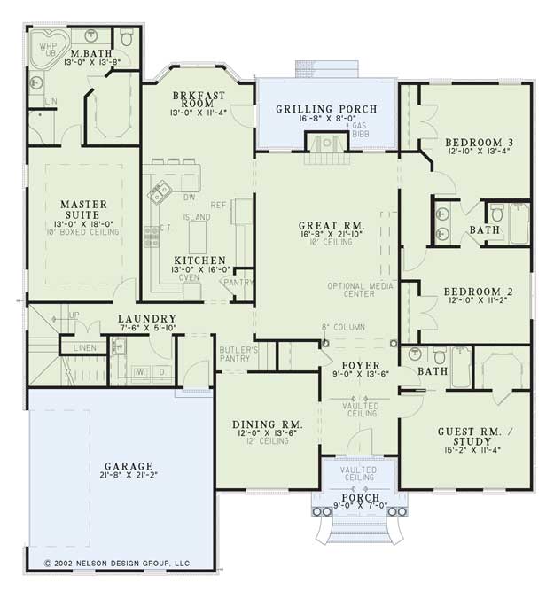 This classic split bedroom Nelson Design Group home plan invites guests in with vaulted ceilings in the front porch and foyer. The formal dining room is open with a twelve-foot ceiling and a conveniently located butler’s pantry. In the great room the fireplace warms guests while they enjoy the media center. The kitchen provides for all with an island and snack bar that opens to the Breakfast room. Afternoon barbecues on the rear grilling porch are a neighborhood favorite. Relax in the private master suite and bath with a corner whirlpool bath, split vanities, separate shower and walk-in closet. Upstairs the kids can enjoy the bonus room and the computer center is nearby for homework projects.