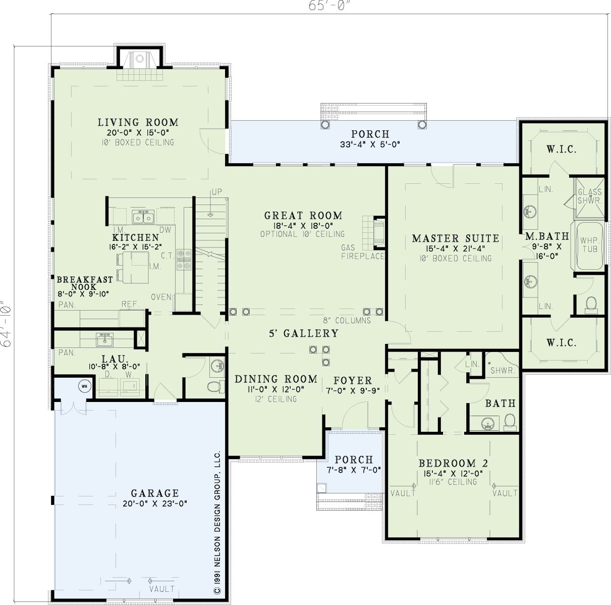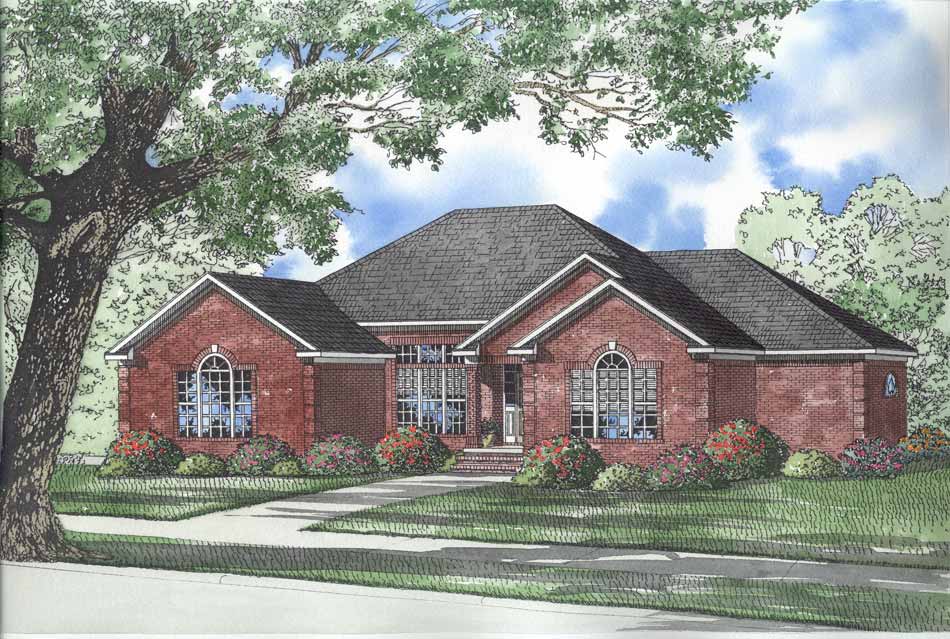 Impressive rounded top windows and smooth gables add symmetry to this Nelson Design Group home. Eight-inch columns and boxed ceilings and two fireplaces give this split bedroom design elegance and warmth for exquisite entertaining. An irresistible master suite has French door entry into the private bathroom loaded with amenities including his and her walk-in closets and separate vanity areas. The kitchen has a wall of windows for natural light and a nearby laundry room.