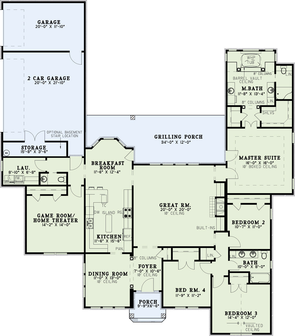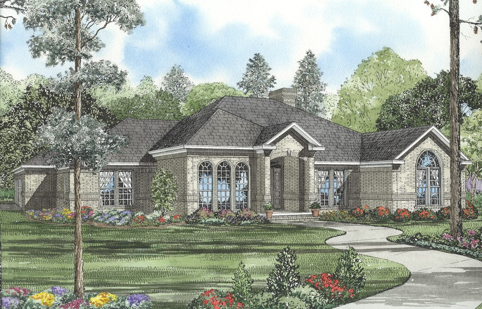 Several arched windows add elegance to the exterior of this Nelson Design Group home. Welcome guests through the foyer and into the formal dining room with columns and plenty of windows. The expansive great room will be perfect for entertaining with built-in shelving and an inviting fireplace. While the kids enjoy the Game Room/Home Theater you can relax in your private Master Suite, tucked quietly away at the rear of this home.