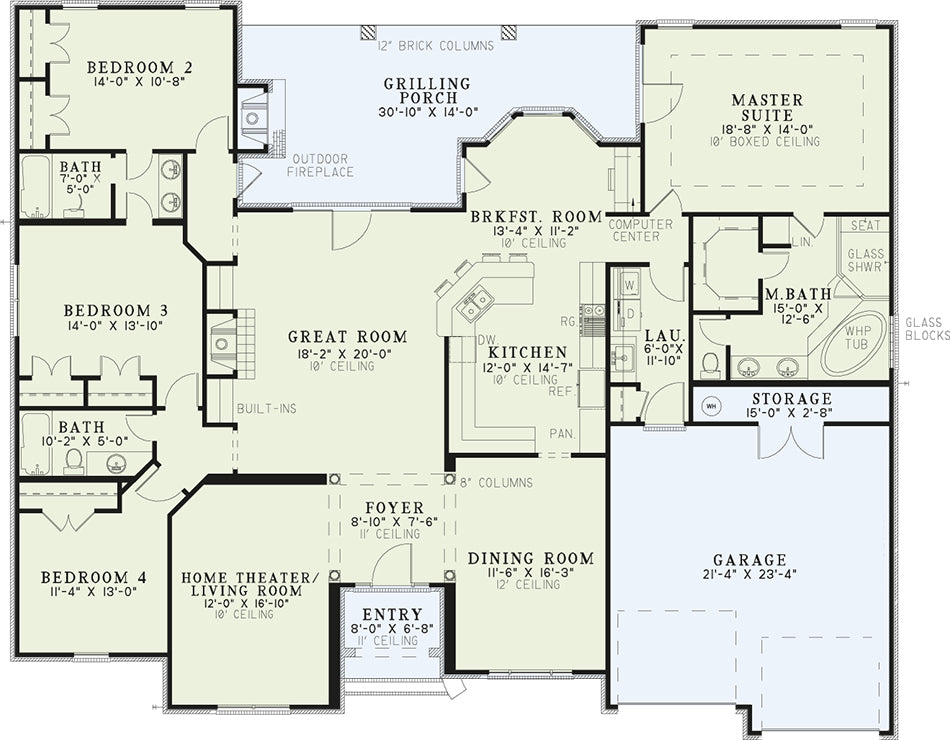 You’ll be glad to call this Nelson Design Group home your own. Gorgeous columns frame the entryway into the spacious great room with a fireplace. Serve your dinner guests in the elegant dining room for formal occasions, or fire up the grill year round on the huge rear grilling porch with an outdoor fireplace. Three bedrooms and two baths occupy one side of this home while the master suite is privately located on the other. Soak away the day’s worries in your whirlpool tub, or simply relax and enjoy the numerous amenities offered in the home.