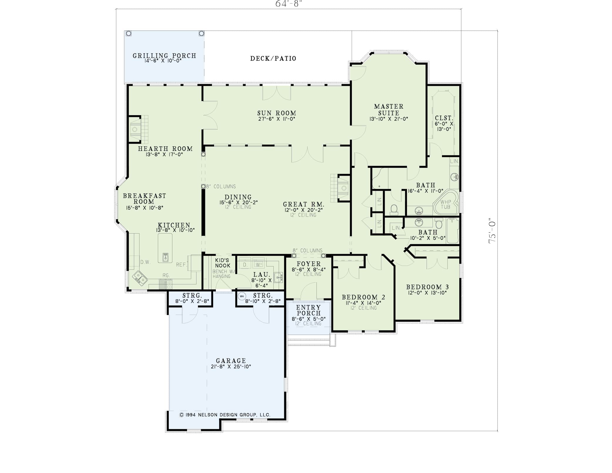 Interesting design and a gorgeous exterior are sure to make this Nelson Design Group home a family favorite. Enjoy the view from the foyer before stepping into the open great room with fireplace. After school, the kids can drop off their backpacks in the clever kids’ nook before heading into the kitchen for a snack. This home is equipped for all seasons with a hearth room and a large sunroom. A deck and grilling porch are also available for cookouts and gatherings. Two additional bedrooms and an impressive master suite help to complete this unique design.