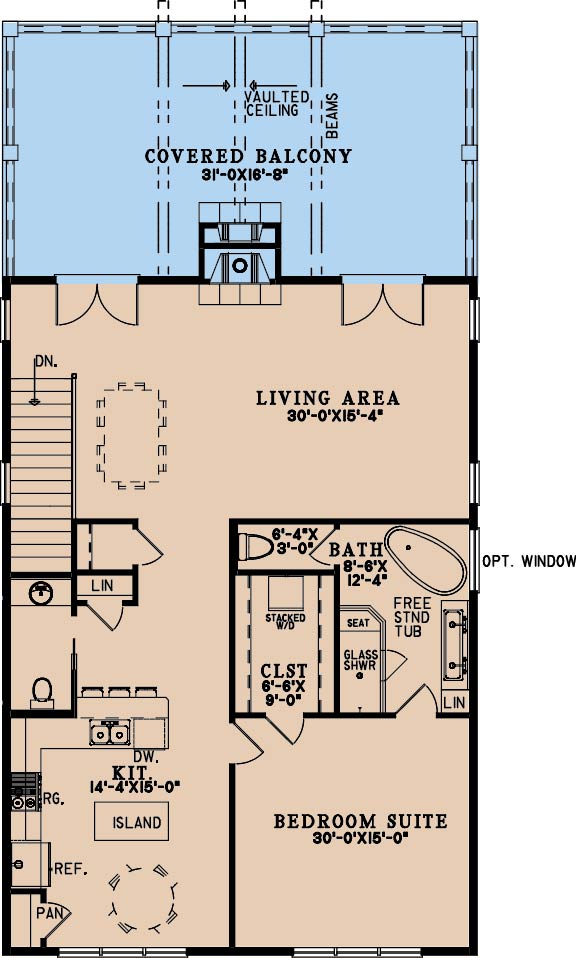 - Vaulted ceiling in the upstairs living area creates an open, airy feel while still maintaining a compact footprint.