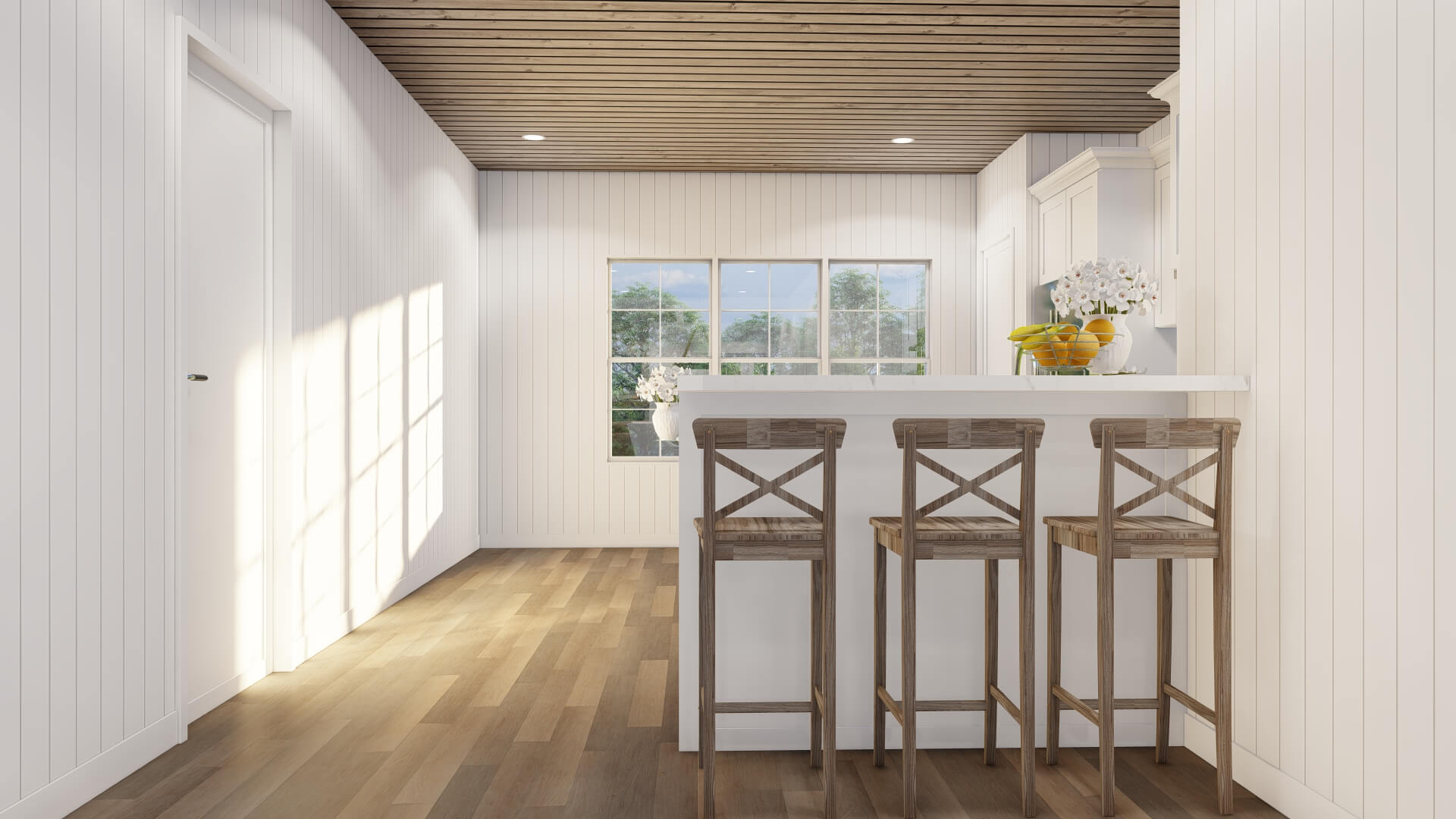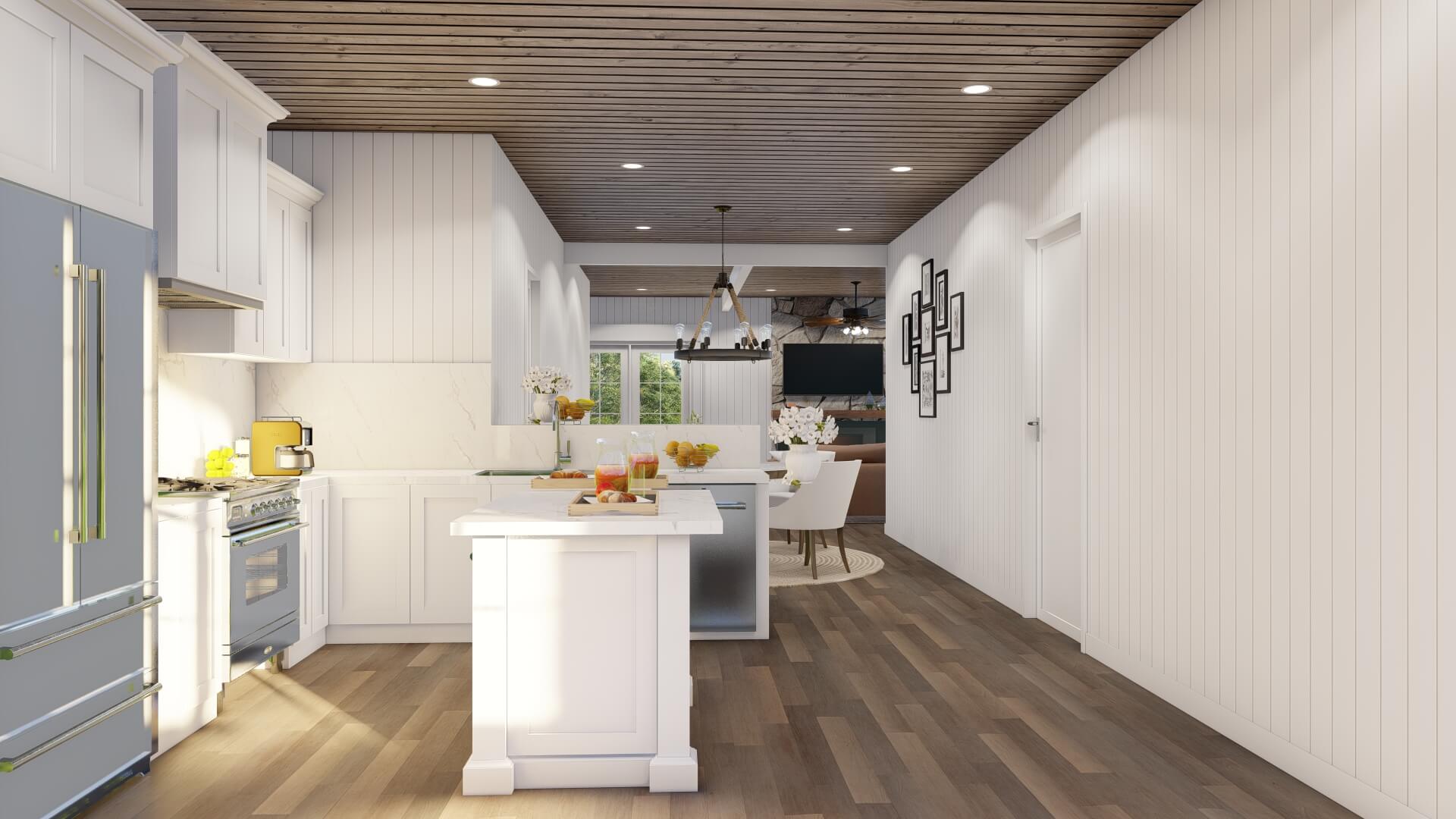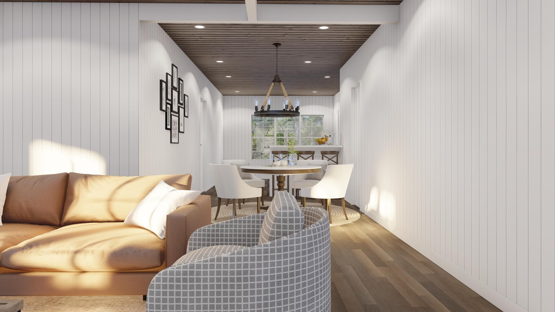 - Upper‑level open floor plan unites kitchen (with island and eating area), living space, and access to a covered balcony overlooking nature—ideal for casual mornings or entertaining.