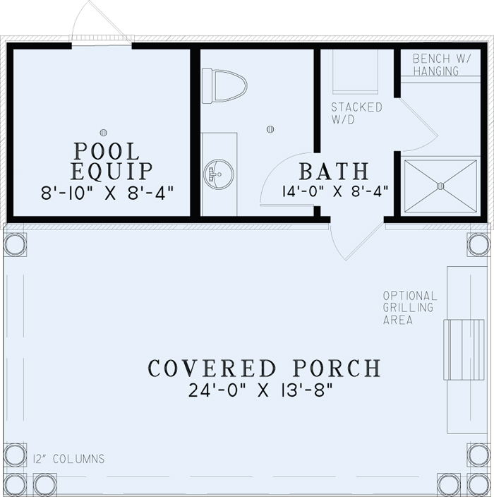 The 1495 is one of our more popular poolhouse plans. This charming pool house offers a large covered porch with an optional grilling area, plenty of space for a table and chairs and/or lounge chairs for entertaining and shelter from the sun. Elegant columns frame the porch, while inside is a bathroom, space for a stacked washer/dryer and a separate shower. Around back is a storage area for pool equipment.