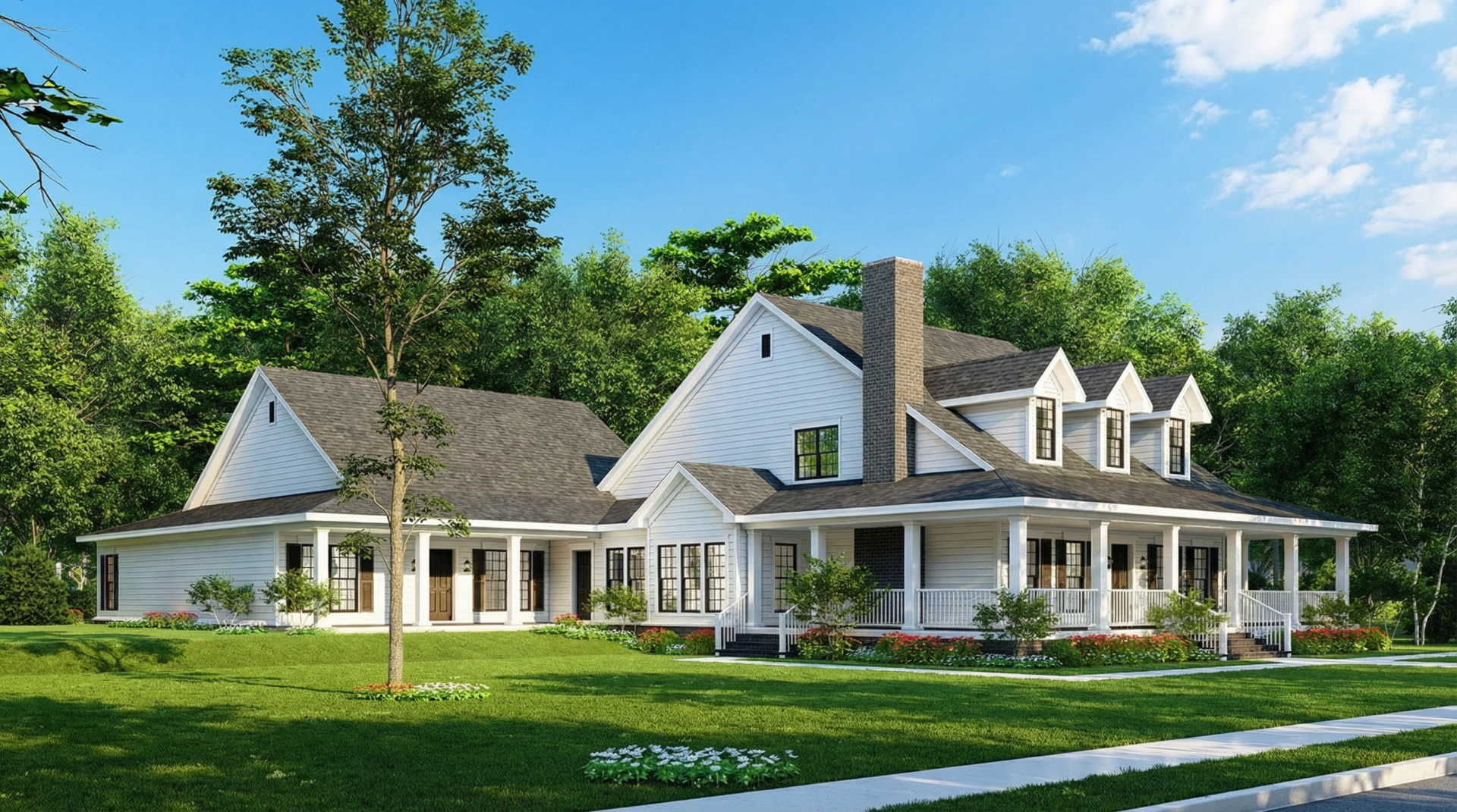 • Architectural Style: A harmonious blend of farmhouse design elements, characterized by a wrap-around porch, black and white exterior color scheme, and detailed moldings.