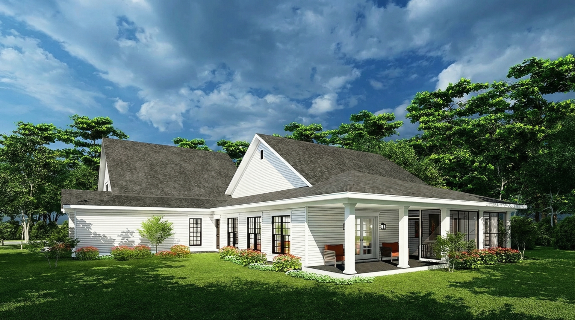 Discover the charm and functionality of the Heartland Farms Farmhouse House Plan from Nelson Design Group. This expansive single-story home combines classic farmhouse elements with modern amenities, offering a spacious and inviting layout ideal for multigenerational living.