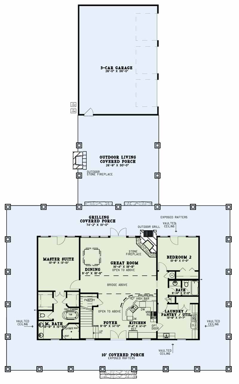 This home is featured in the Riverbend and Waterfront collections. Timber and stone columns are found on the large covered wrap around porch. The open floor plan of this home makes it ideal for the whole family to gather together with plenty of space. In addition to the spacious great room, kitchen, and dining area, the main floor hosts a large master suite, with his and hers closets, bedroom 2, a hall bath, and a spacious laundry/pantry. Upstairs you will find 2 additional bedrooms, one of which can be used as a game room if you wish, and the bridge overlooks the downstairs living space. Even more space for entertaining is found outdoors with this home. From the great room you can access the covered grilling porch and outdoor grill. The outdoor living space is continued with another large covered porch complete with an outdoor stone fireplace. A large 3 car garage completes this home plan.