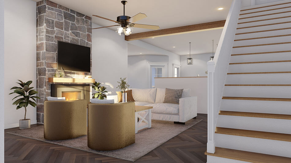 - Great Room with Fireplace: Spacious great room anchored by a stone fireplace, flowing naturally into the kitchen and dining areas for a warm gathering space.