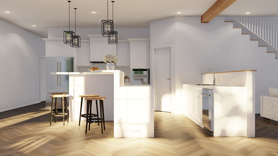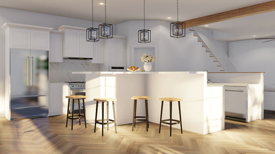 - Open Kitchen & Eat‑At Bar: Large eat‑at island centrally located for functionality, family meals, and casual dining, with easy access to storage and the garage.