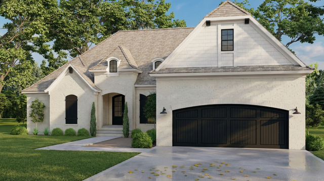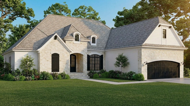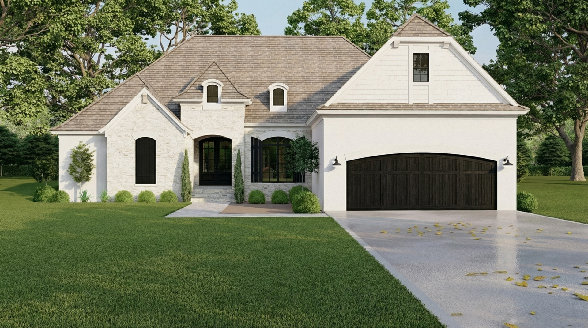 Stone accents combined with a white façade and an arched double-door entry create striking curb appeal, reflecting classic European styling with attention to detail. -