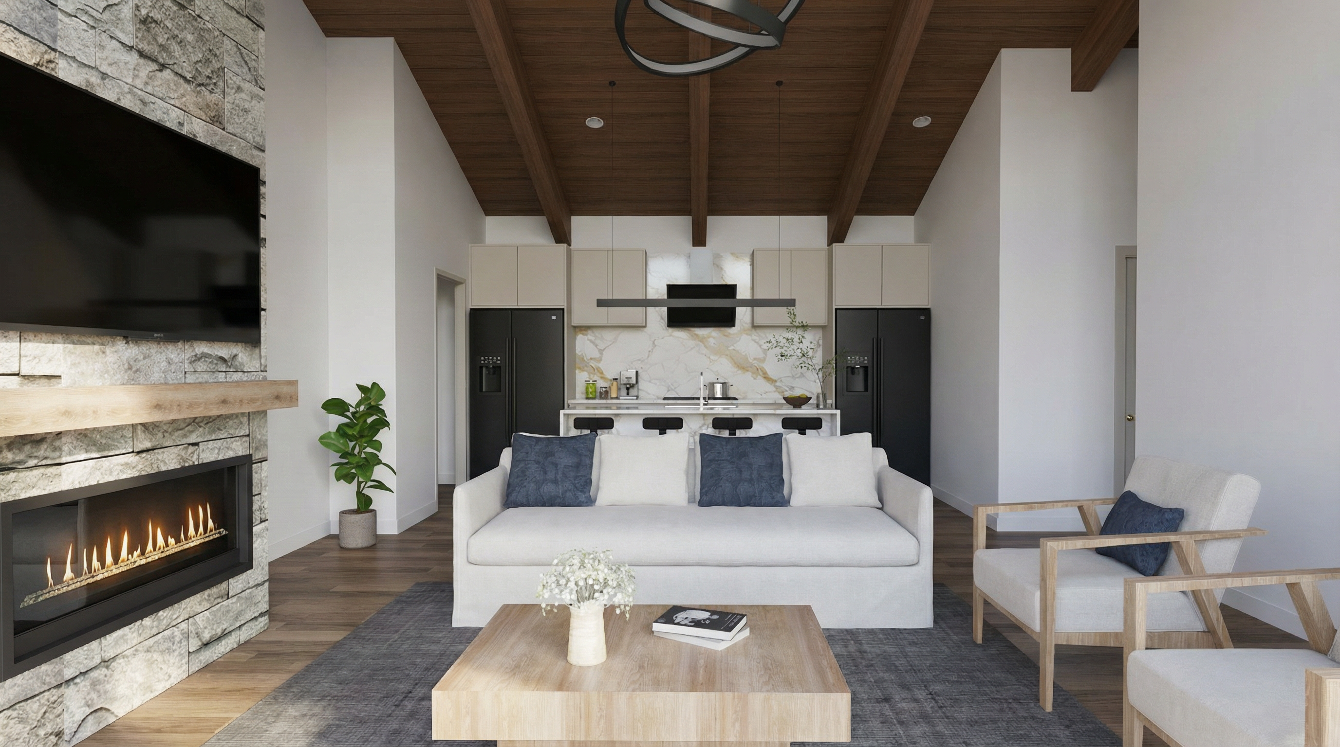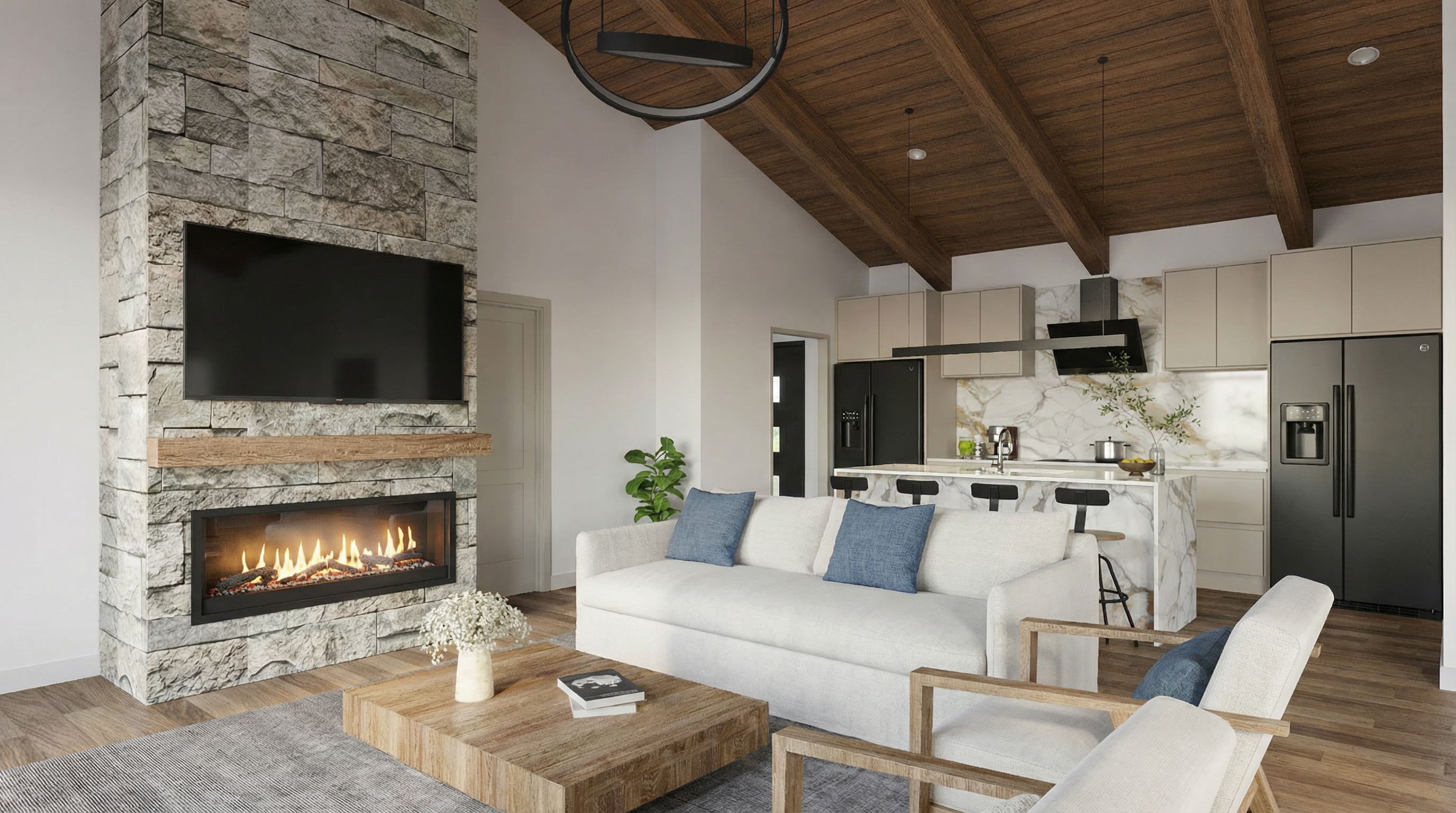 A welcoming covered front porch sets the tone, creating the perfect space for relaxing evenings or morning coffee. Step inside to a spacious great room featuring a dramatic vaulted high cathedral ceiling that enhances natural light and creates an airy, expansive feel. The open flow continues into the kitchen, where a functional kitchen island provides additional prep space, seating, and a central gathering point for entertaining.