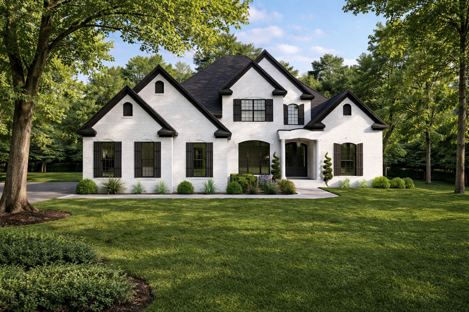 A clean white façade accented with bold black trim and shutters gives Westinview Place a sophisticated yet inviting presence. The timeless architectural lines and covered front entry create a truly impressive first impression. -