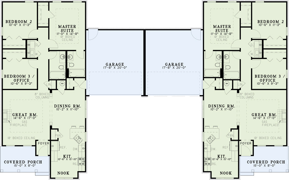 We have created a duplex ly combining two homes for cost efficiency. These homes feature ten-foot boxed ceilings in the great rooms and master suite bedrooms giving a more formal effect while allowing more natural light to flow throughout. The dining rooms have a boxed column entry and view the great room fireplace for the utmost in atmosphere. Step saver kitchens have a large pantry, additional bar seating and enjoy a front view of the well-manicured lawn.