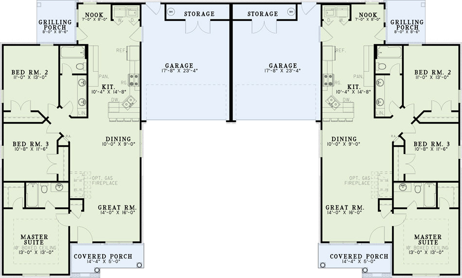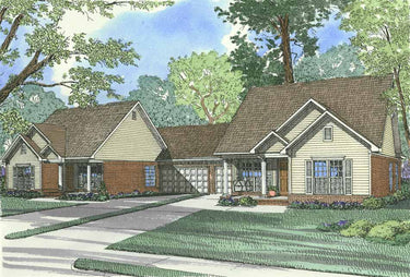 Tiered gables and covered porches give this duplex a warm welcome. Each home has a large great room with optional fireplace opening to a large dining area with additional seating at the shared kitchen bar counter. The kitchen views the dining and great rooms allowing for great entertaining options while a small breakfast nook is gently tucked in the rear of the kitchen enjoying a view of the back yard and corner-grilling porch. A roomy master suite is privately separated from the additional bedrooms and is enhanced with a ten-foot boxed ceiling and walk-in closet.