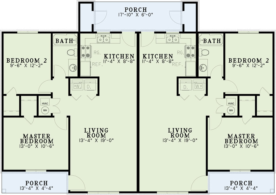 This two bedroom duplex plan allows neighbors privacy as well as a shared rear porch for afternoon conversation. An enormous living room opens to the kitchen and gives you many options for furniture arrangement. A handy storage room located on the rear porch is available for a clutter free backs