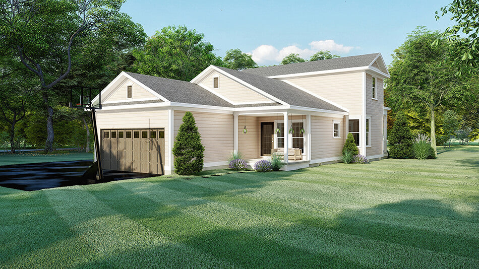 - Exterior Design: Features crisp white board-and-batten siding with cool gray shutters, complemented by a 21-foot covered front porch with railing, ideal for relaxing mornings and evenings.