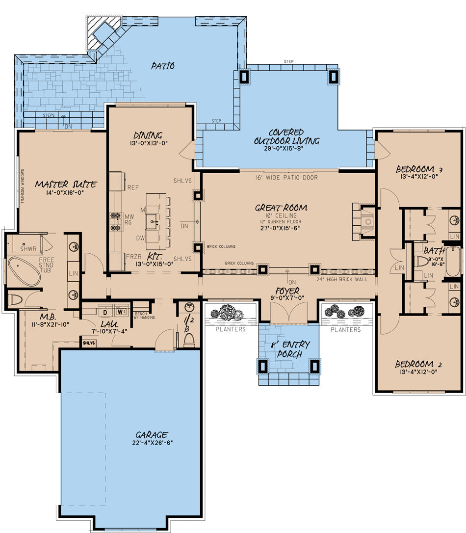 - Outdoor Living Area: Accessible from the Great Room, Dining area, and Bedroom 3, featuring brick column elements to unite the front exterior design with the rear of the home.