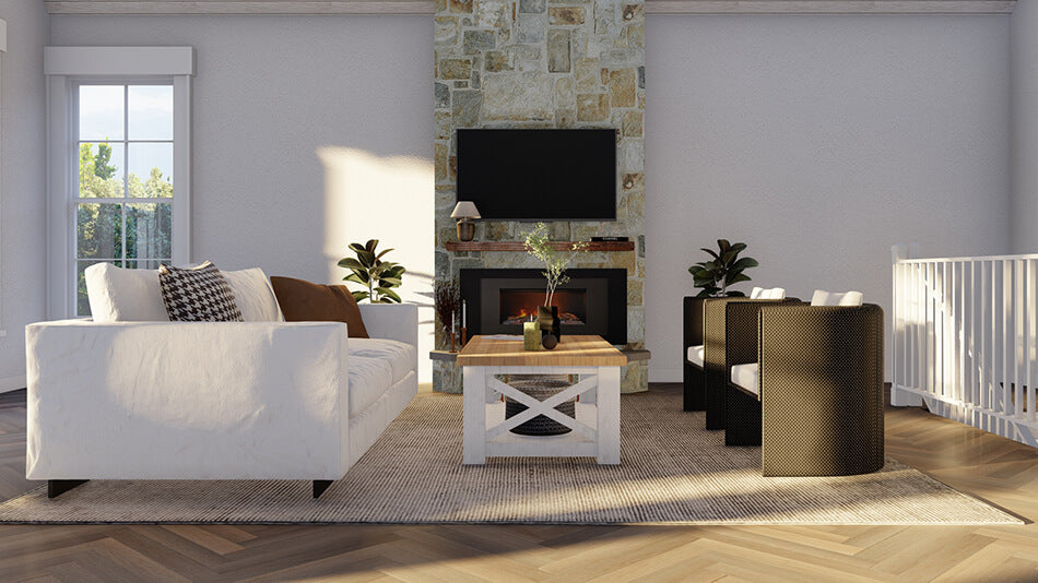 - Wrap-around covered porch with a corner fireplace and grilling area — perfect for outdoor living and entertaining