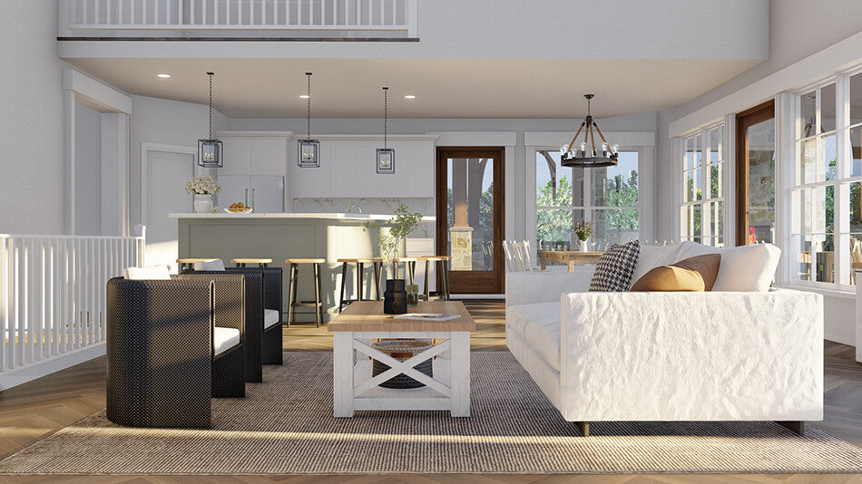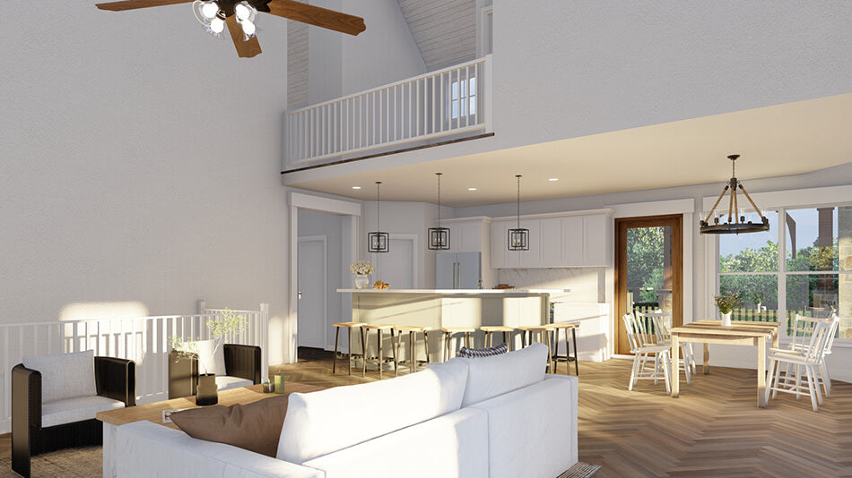 - Open Great Room featuring a stone fireplace and vaulted ceiling, flowing easily into the Kitchen and Dining Area
