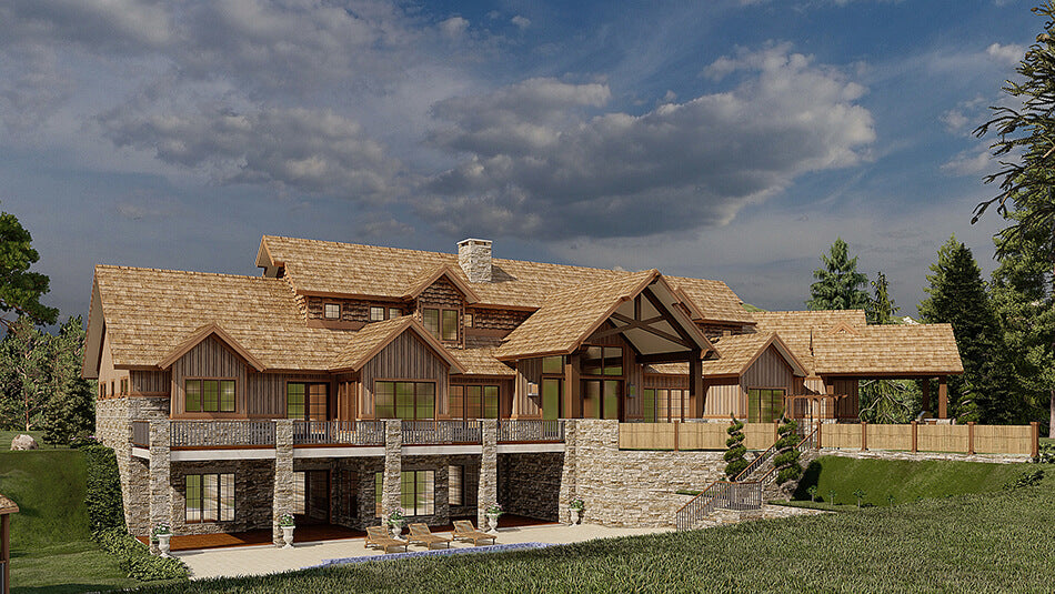 - Rustic lodge exterior with timber and stone accents, large gables, and generous porches for dramatic curb appeal