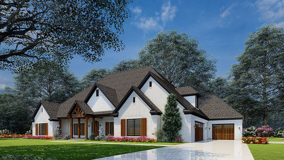 - Design Style: Elegant Traditional with classic rooflines and brick accents
