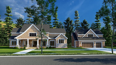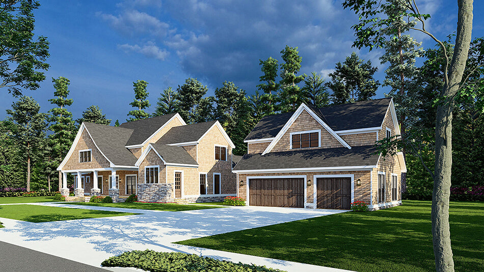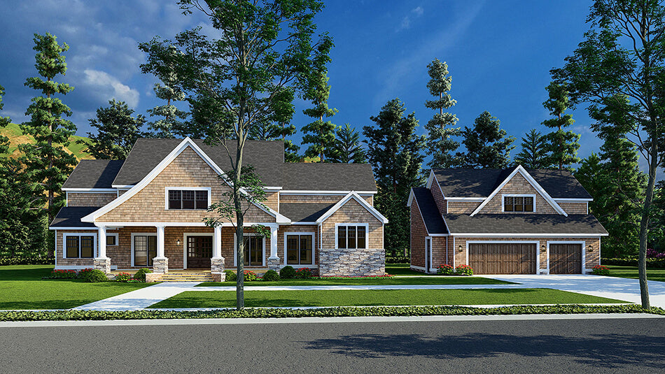 Discover refined country estate living with the Southern Exposure House Plan MEN 5303, a 3,448 sq ft home with 5 bedrooms and 5 full baths plus a half bath. Featuring a grand covered front porch, expansive great room with fireplace, and striking stone and shaker-style exterior, this two-story plan is built for luxury, entertaining, and relaxed everyday living.
