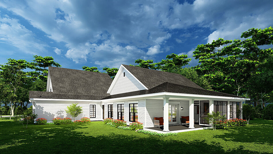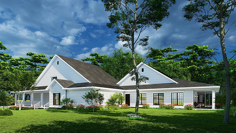 Discover the charm and functionality of the Heartland Farms Farmhouse House Plan from Nelson Design Group. This expansive single-story home combines classic farmhouse elements with modern amenities, offering a spacious and inviting layout ideal for multigenerational living.